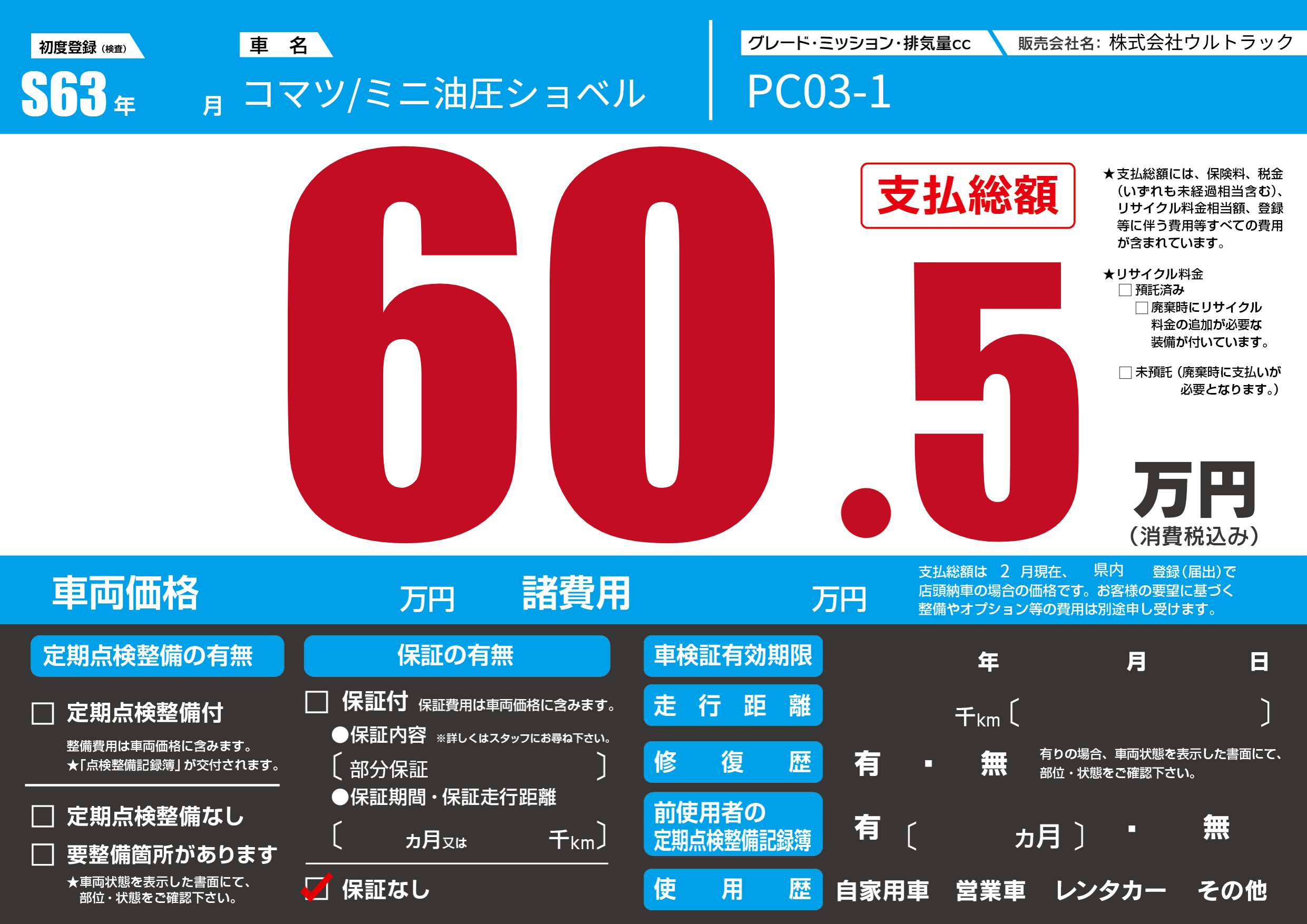 | 車名 | コマツ/ミニ油圧ショベル | グレード ミッション 排気量 |