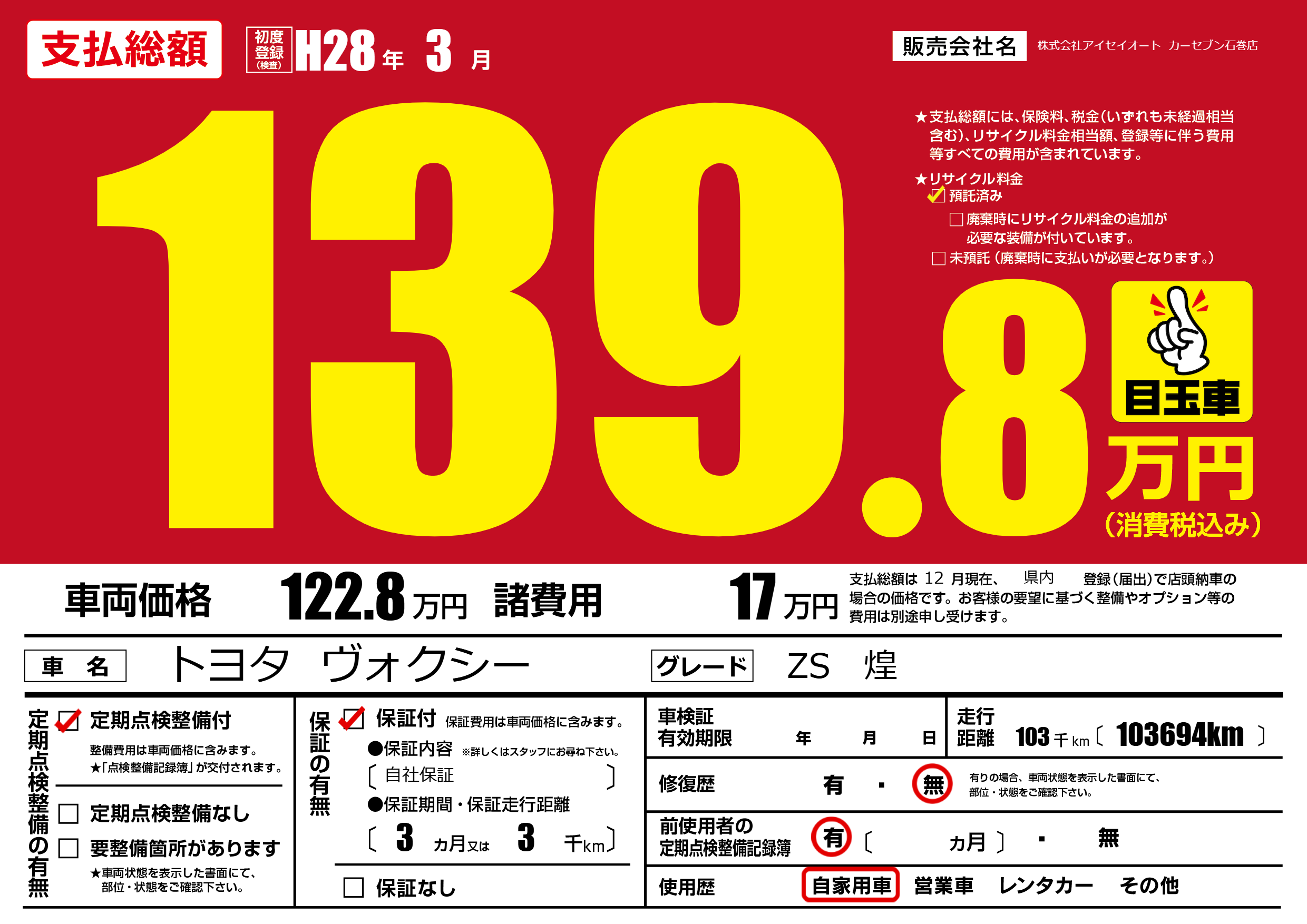 | 走行キロ | 10.3万km | 初年度登録 | H28年3月 |