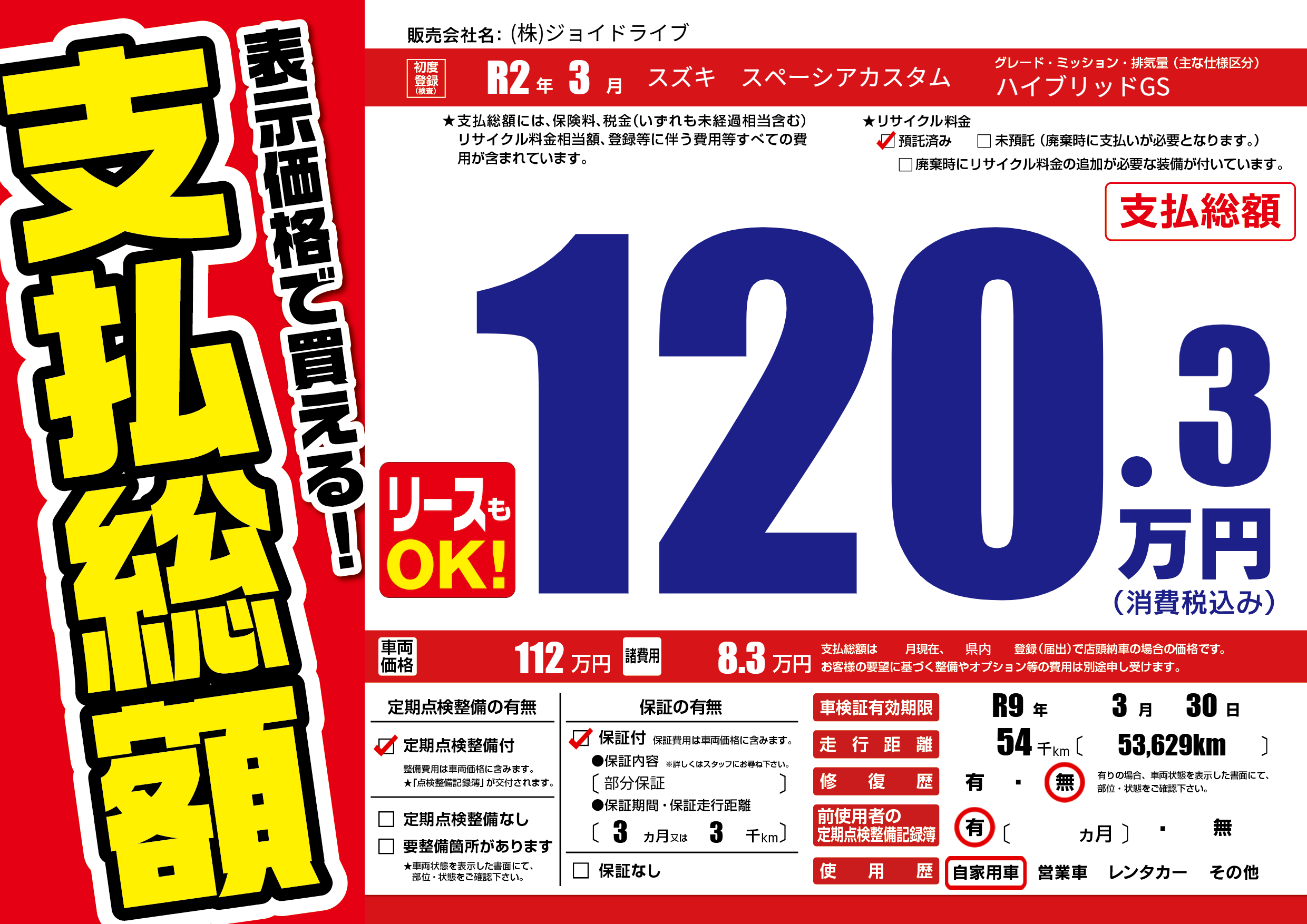 | 車名 | スズキ スペーシアカスタム | グレード ミッション 排気量 |