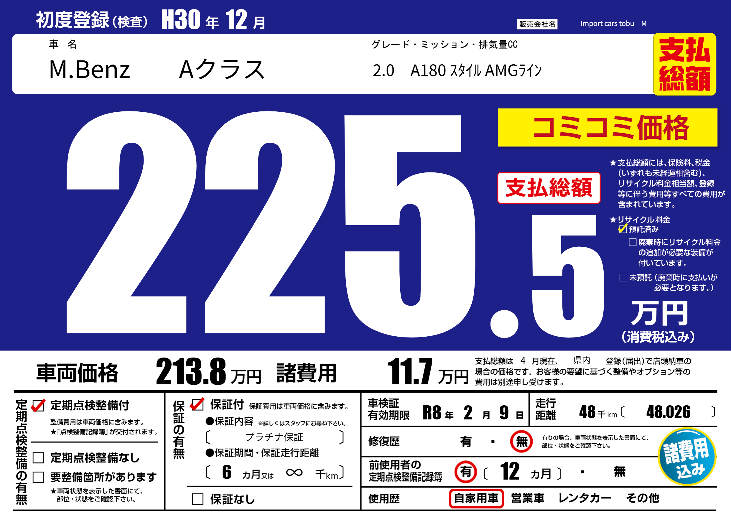 保証付き 保証内容( プラチナ保証) 6ヶ月または(∞)千kmまで |