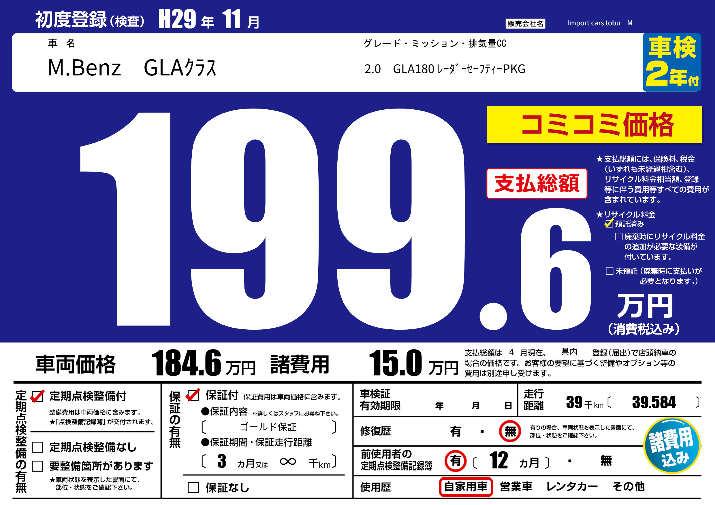 | 車名 | M.Benz GLAクラス | グレード ミッション 排気量 |