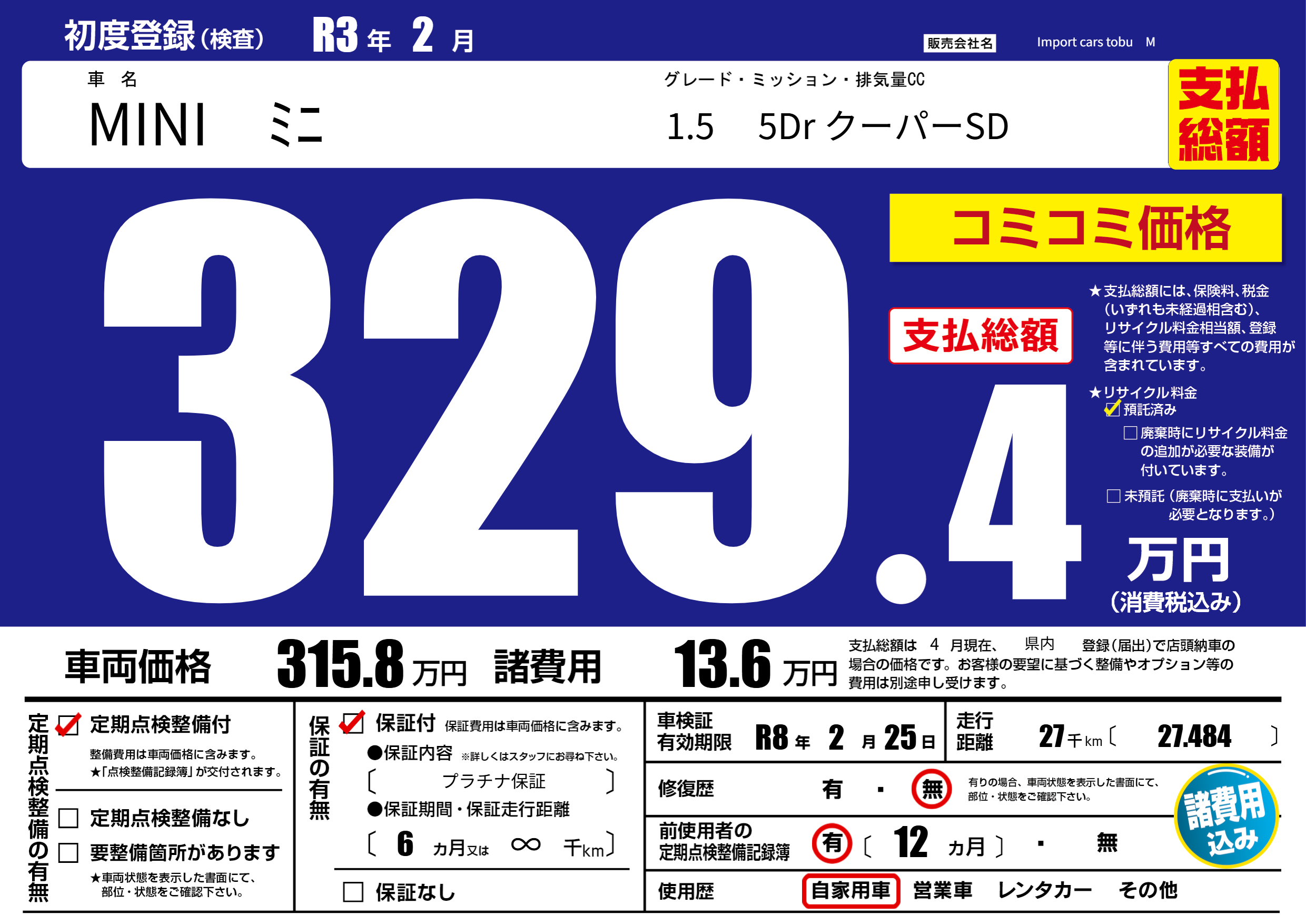 | 車名 | MINI ミニ | グレード ミッション 排気量 |