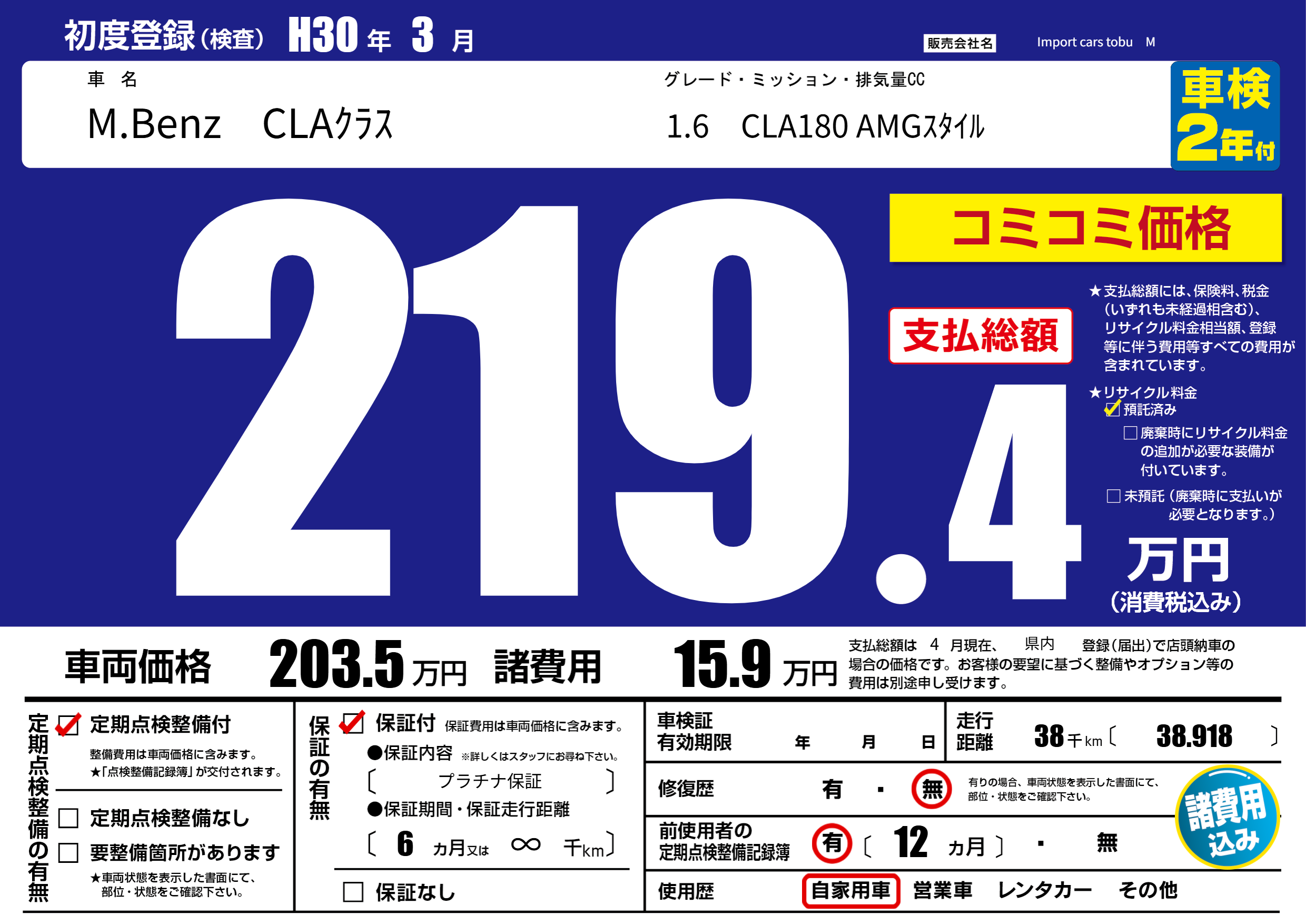 保証付き 保証内容( プラチナ保証) 6ヶ月または(∞)千kmまで |