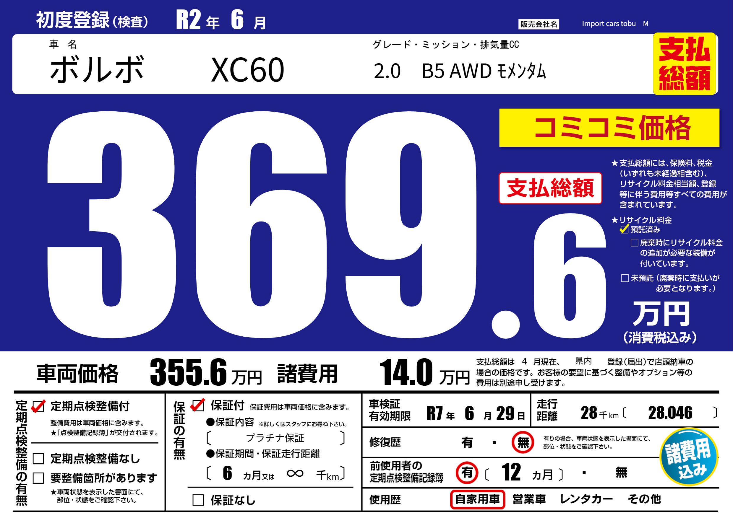 | 車名 | ボルボ XC60 | グレード ミッション 排気量 |