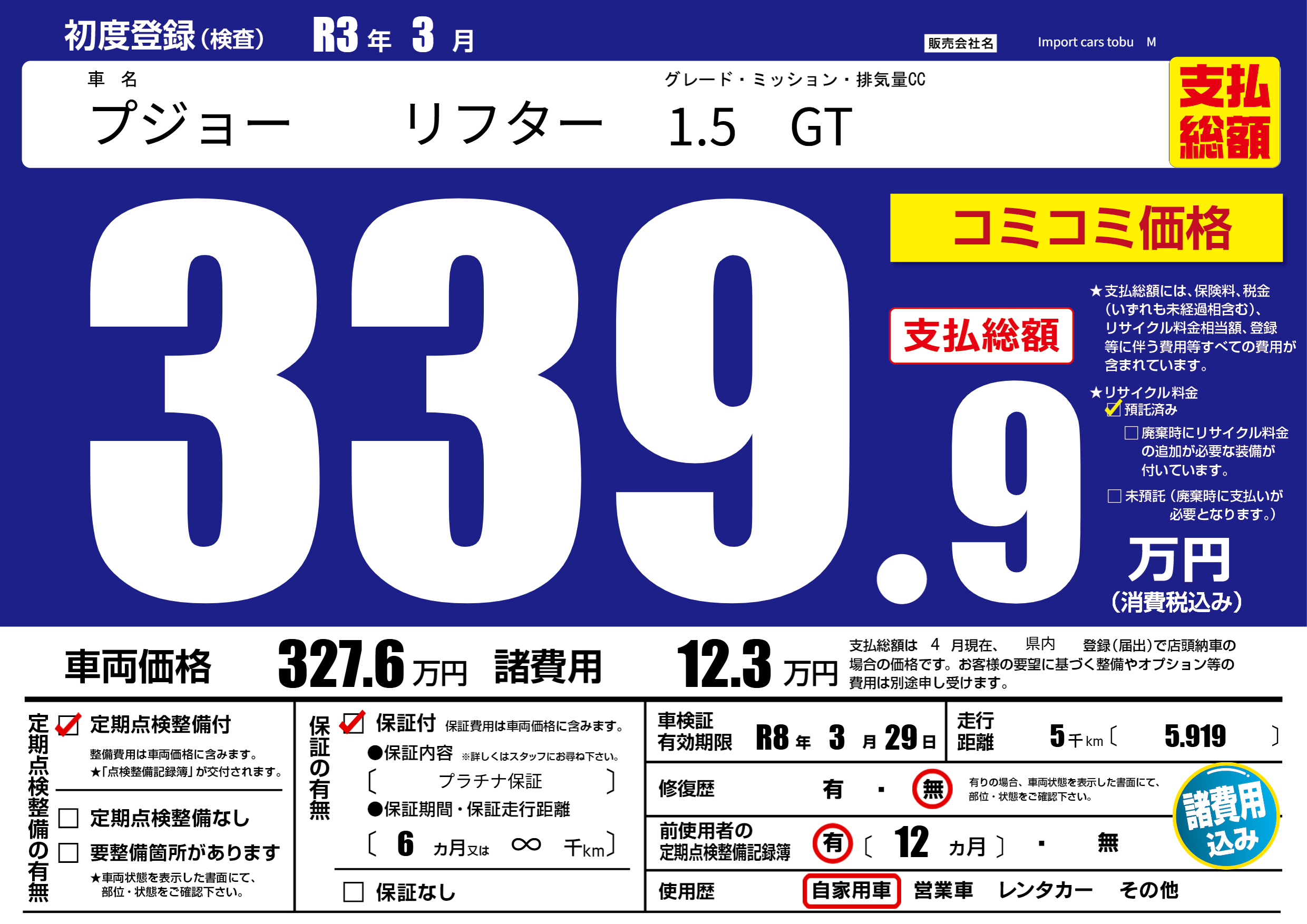 保証付き 保証内容( プラチナ保証) 6ヶ月または(∞)千kmまで |