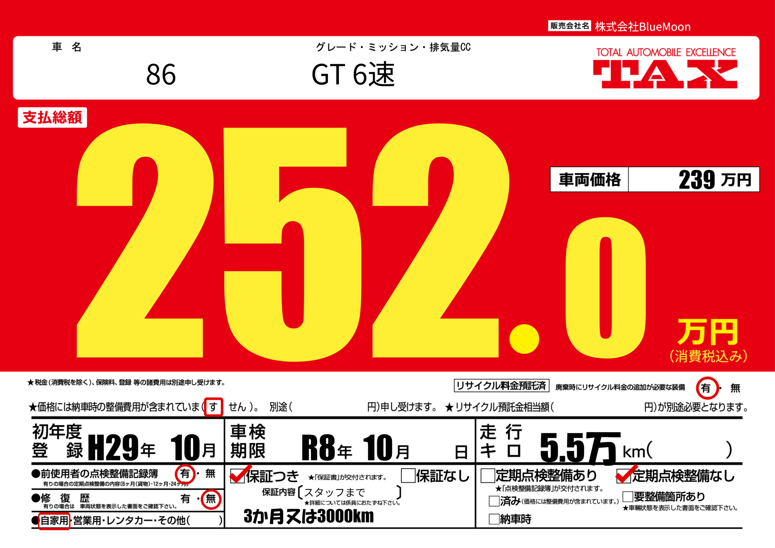 | 走行キロ | 0.5万km | 初年度登録 | H29年10月 |