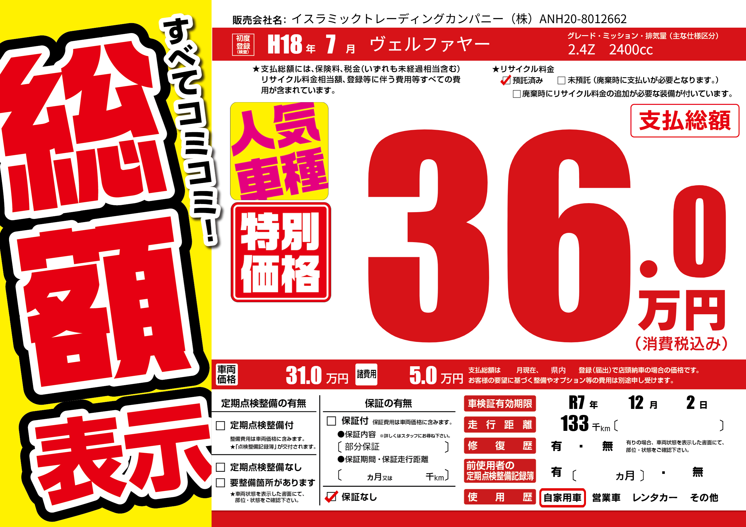 なし | 車検制限 | R7年12月2月 |