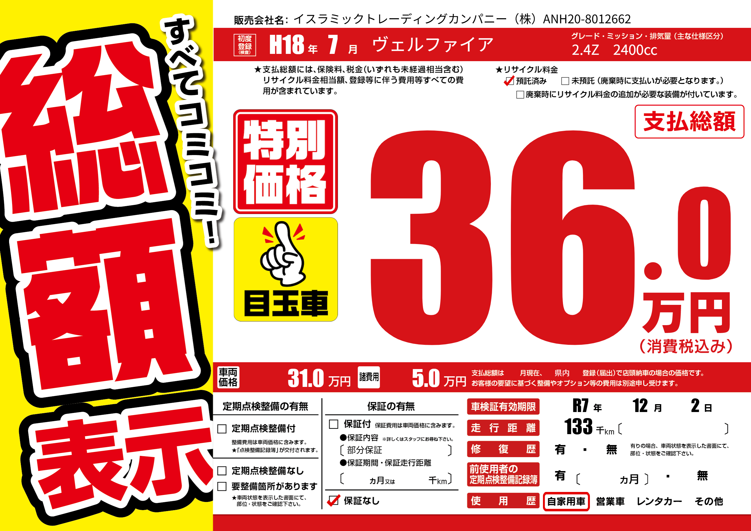 | 車名 | ヴェルファイア | グレード ミッション 排気量 |