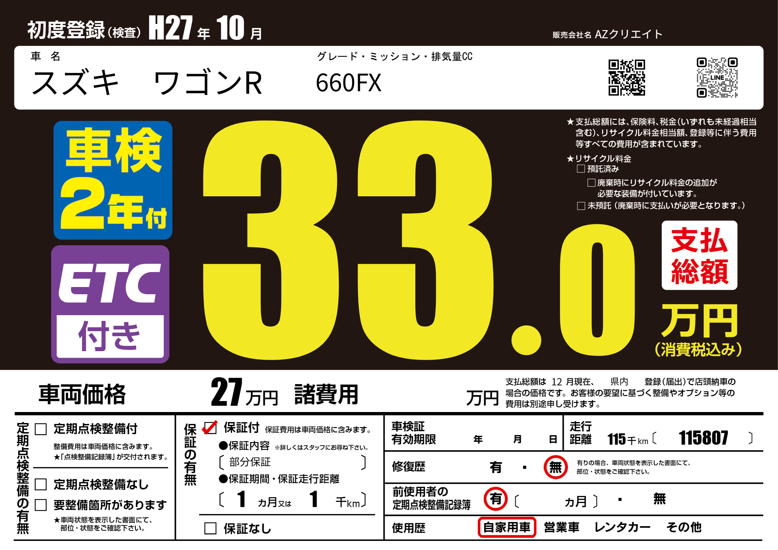 | 走行キロ | 11.5万km | 初年度登録 | H27年10月 |