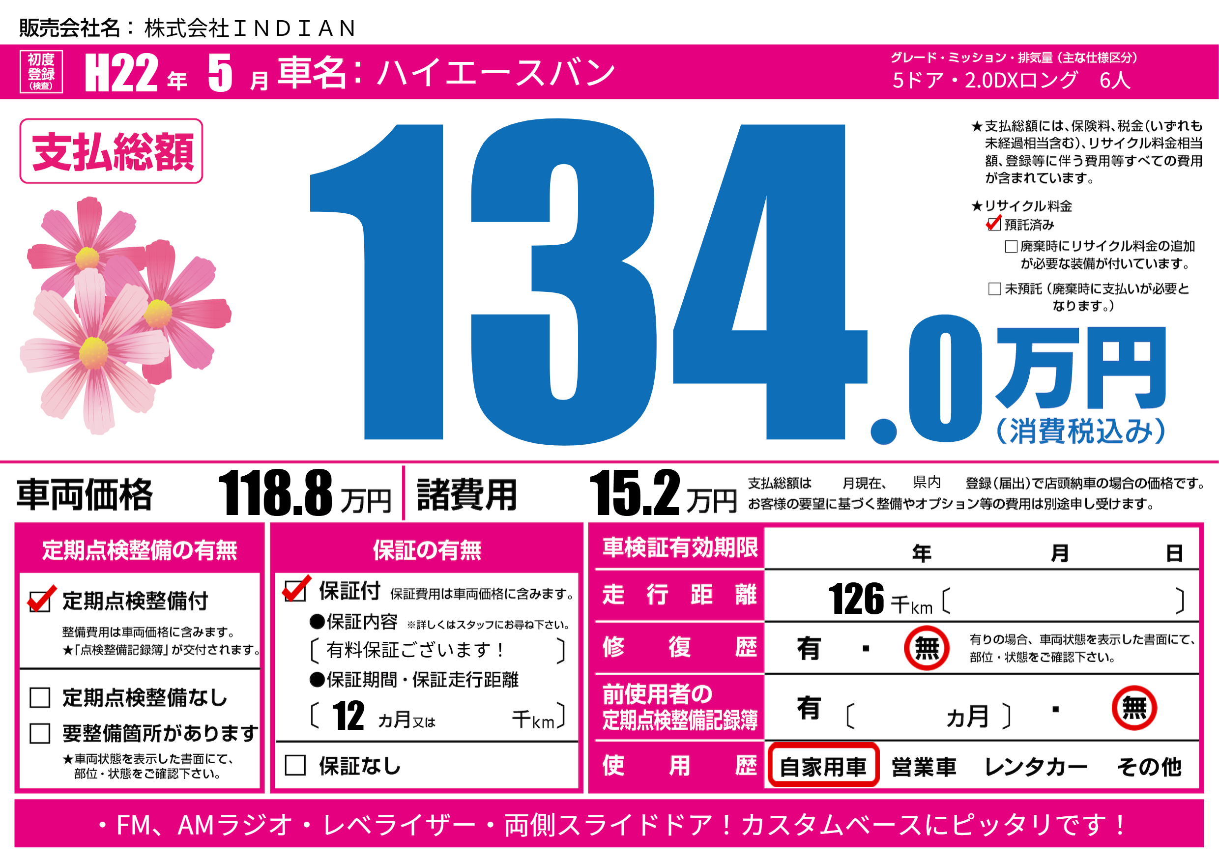 | 走行キロ | 12.6万km | 初年度登録 | H22年5月 |
