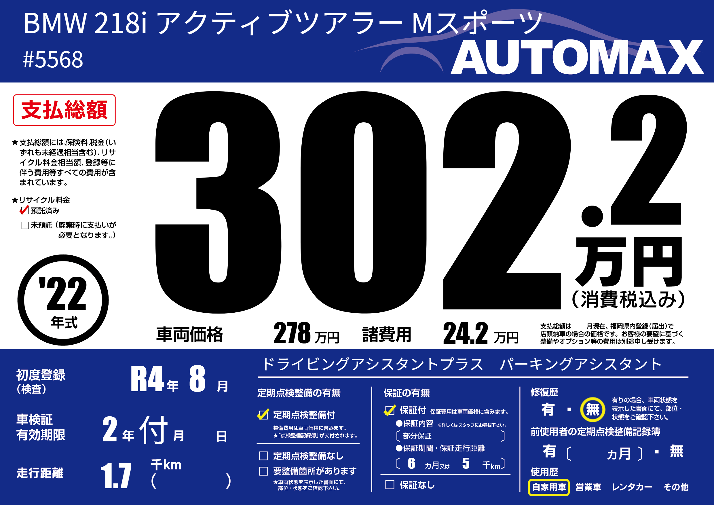 | 車名 | BMW 218i アクティブツアラー Mスポーツ | グレード ミッション 排気量 |