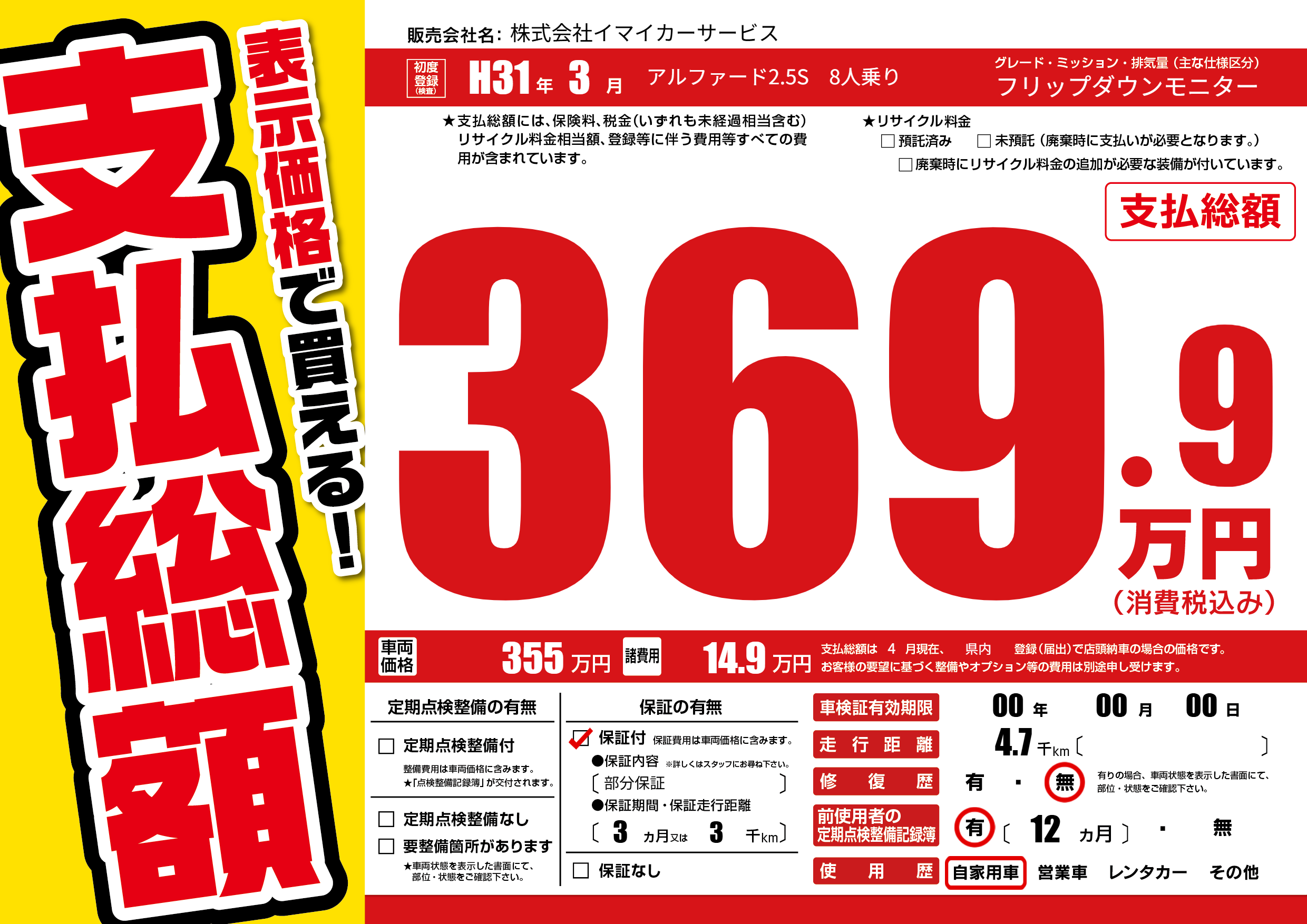 | 走行キロ | 0.4万km | 初年度登録 | H31年3月 |
