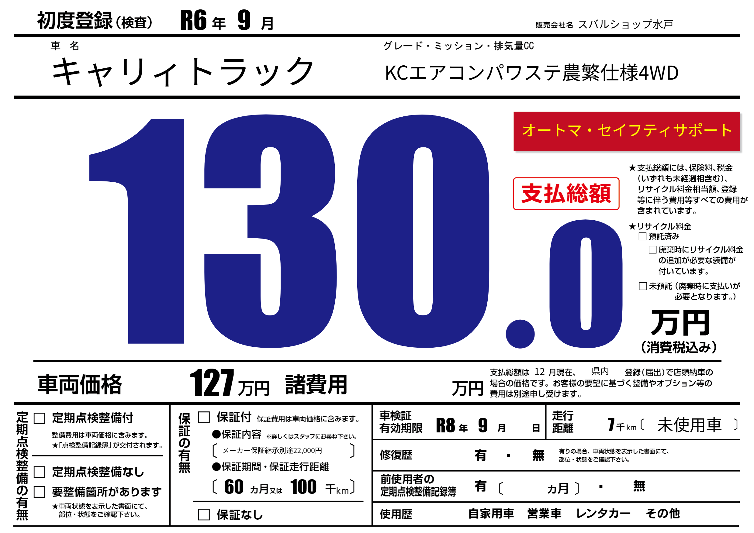 | 車名 | キャリィトラック | グレード ミッション 排気量 |