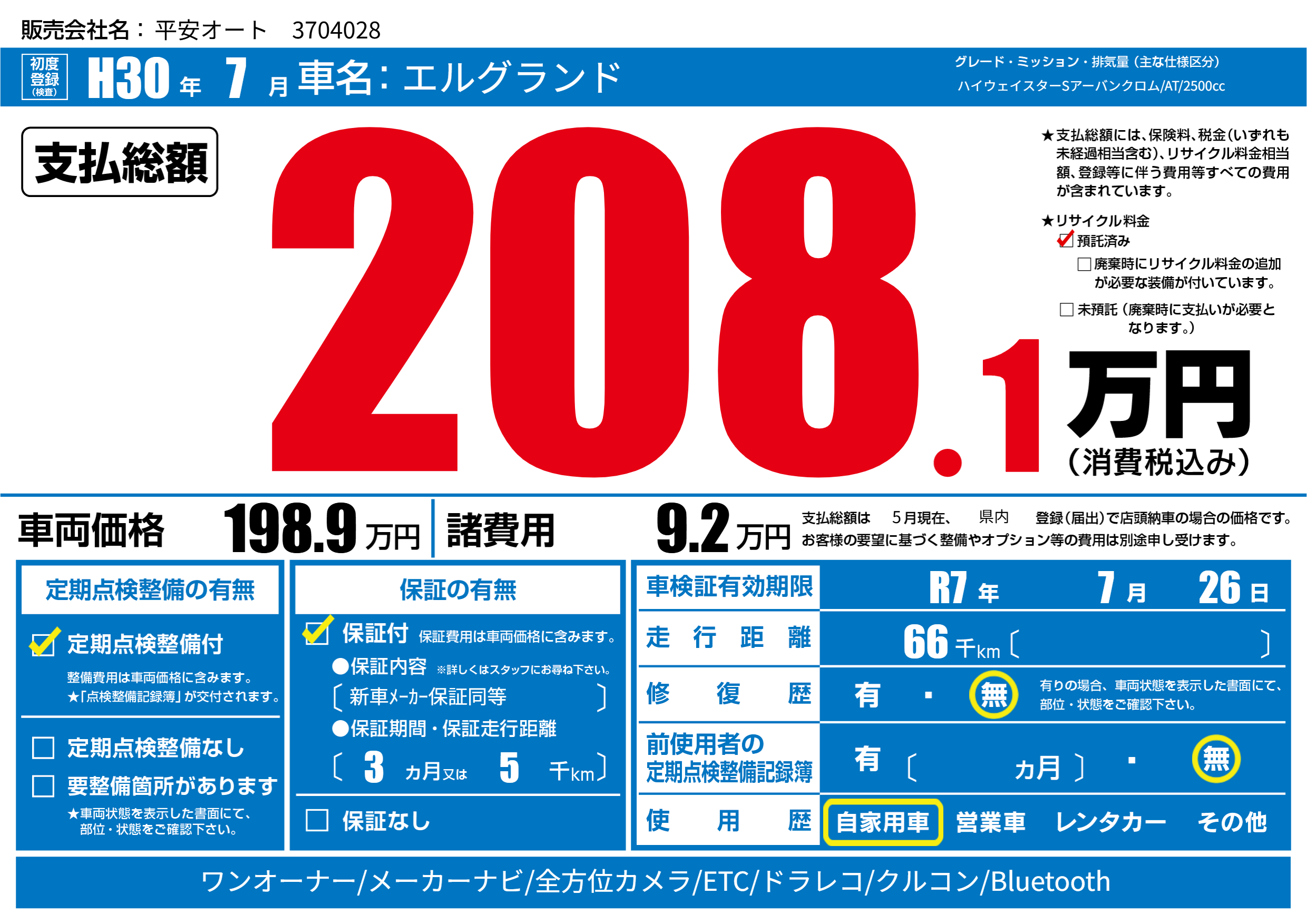 | 走行キロ | 6.6万km | 初年度登録 | H30年7月 |