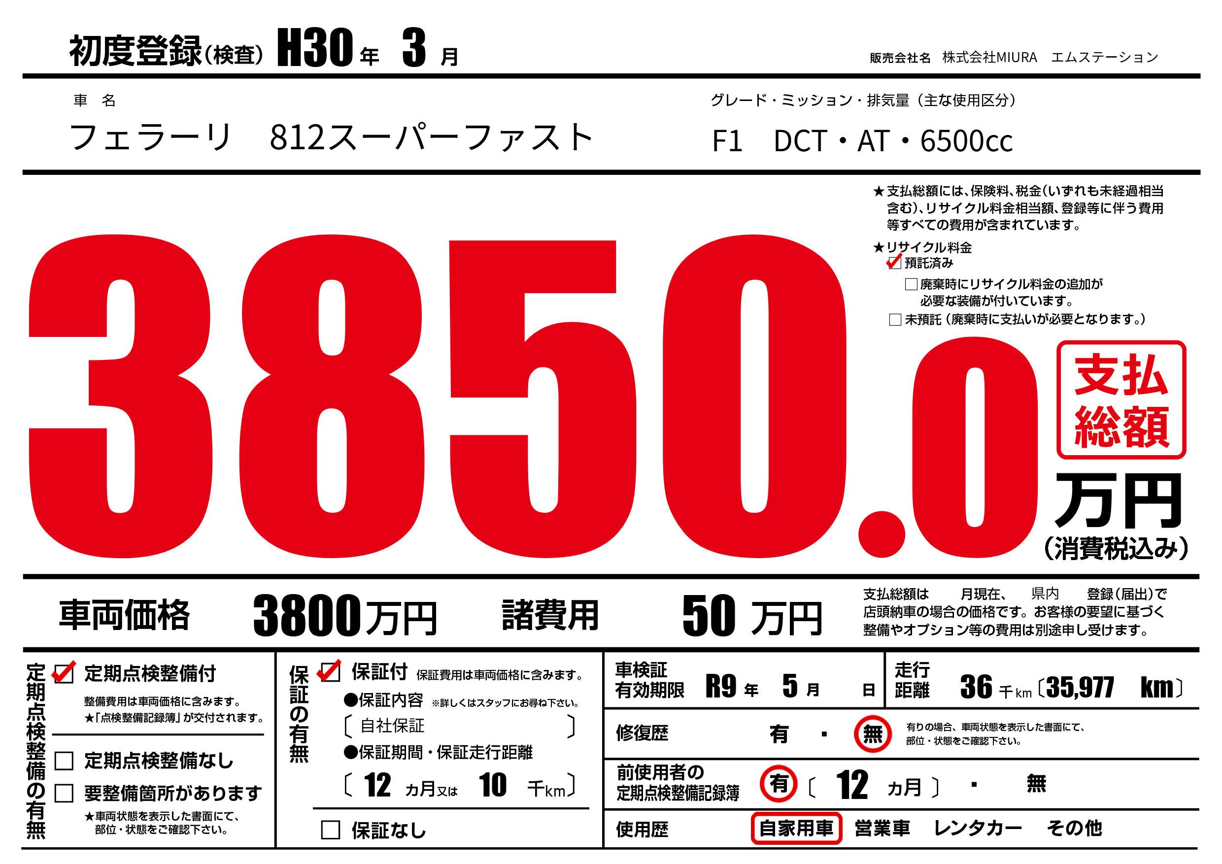 | 車名 | フェラーリ 812スーパーファスト | グレード ミッション 排気量 |