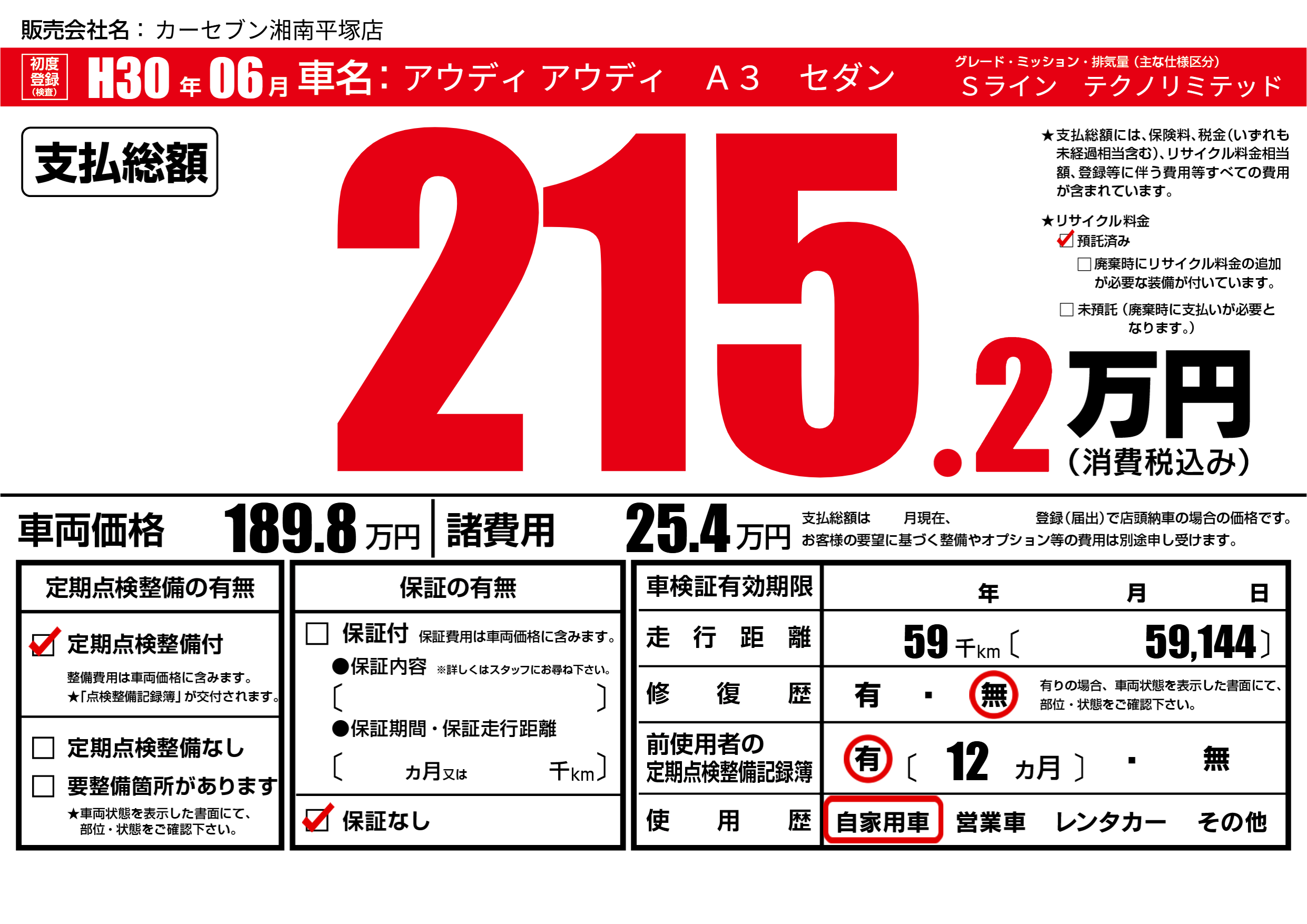 | 車名 | アウディ アウディ A3 セダン | グレード ミッション 排気量 |