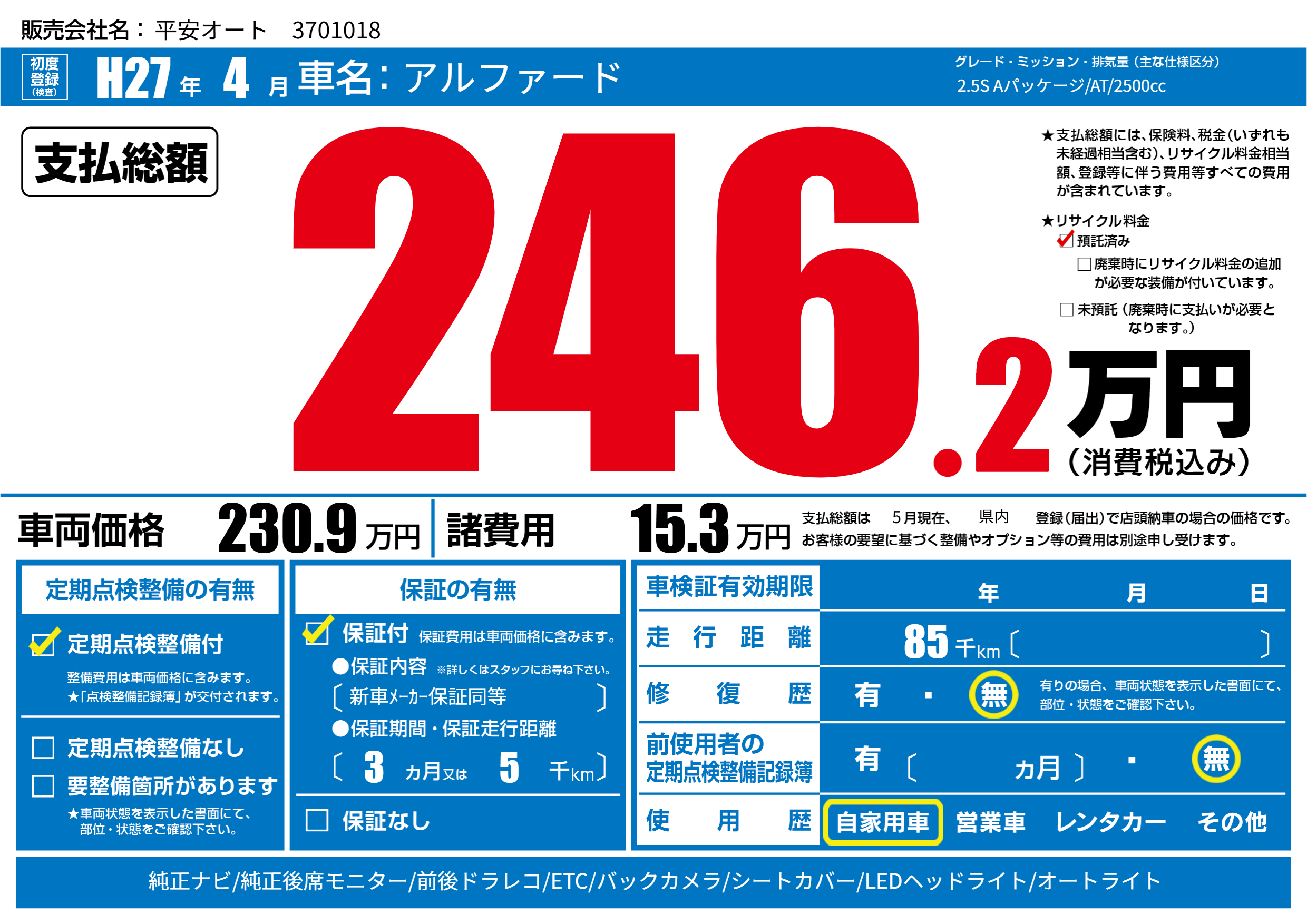 | 車名 | アルファード | グレード ミッション 排気量 |