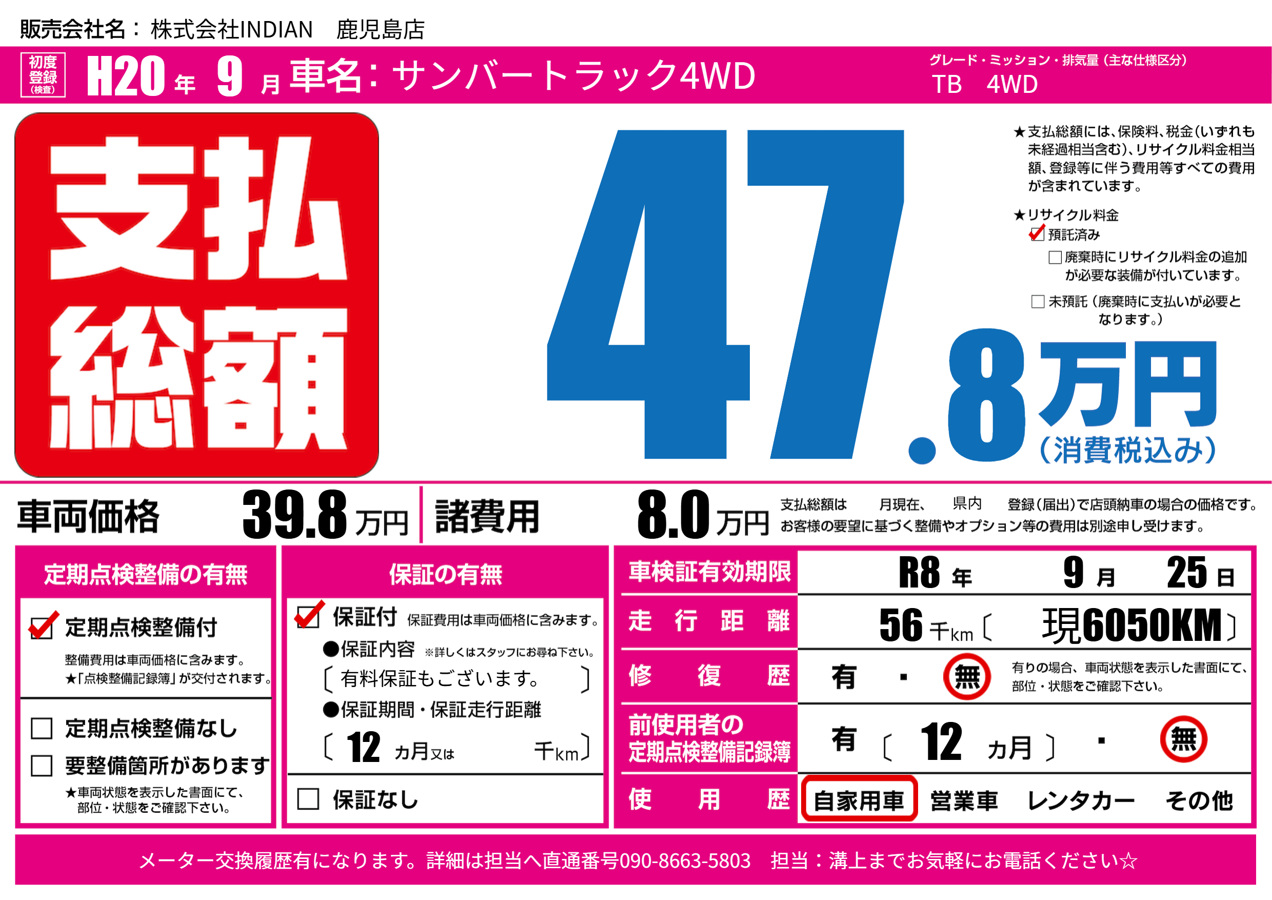 | 車検制限 | R8年 9月 25日 | ||