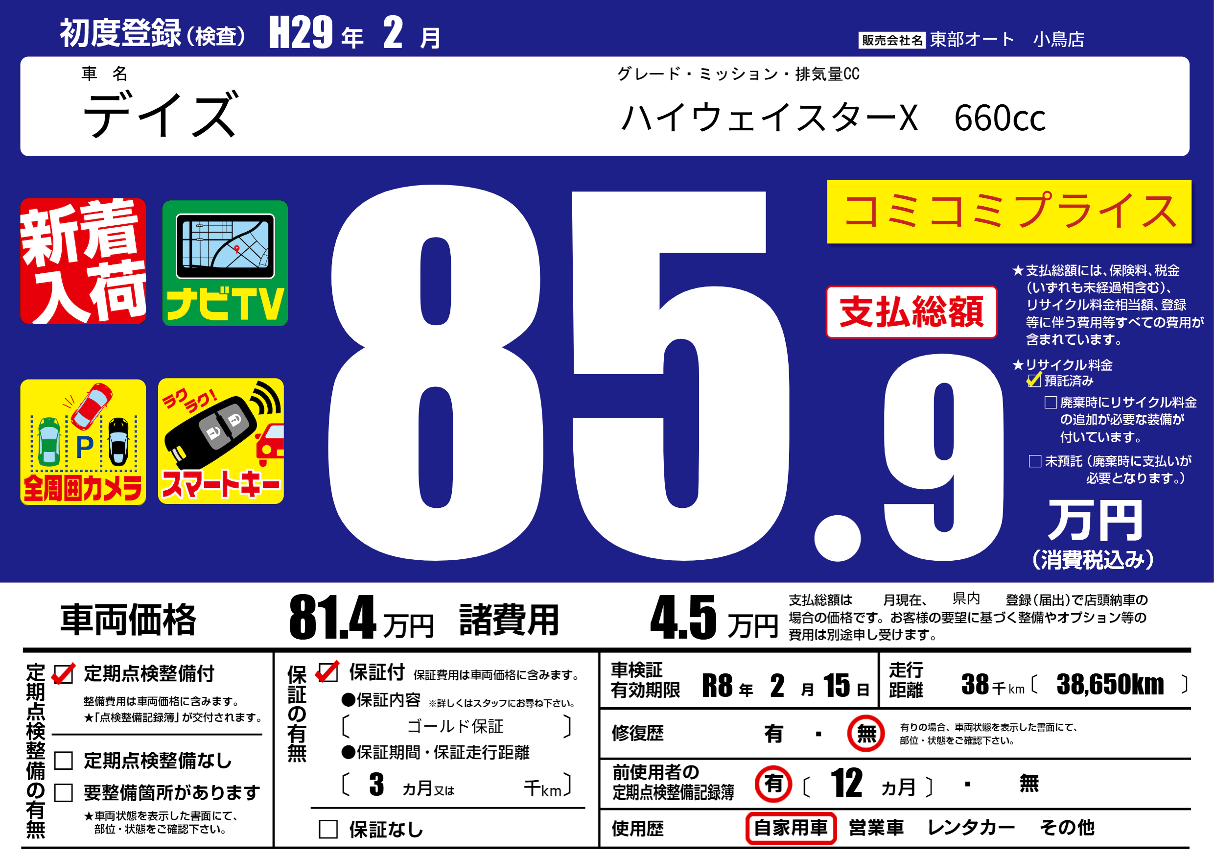 | 走行キロ | 3.8万km | 初年度登録 | H29年2月 |