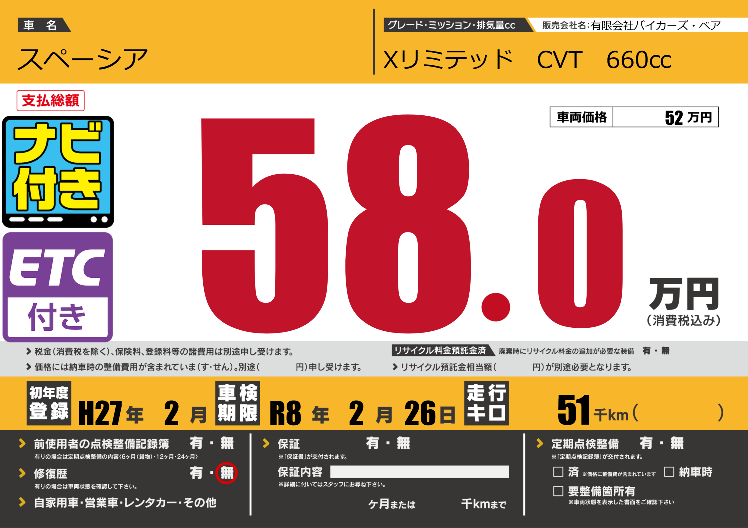 | 走行キロ | 5.1万km | 初年度登録 | H27年2月 |