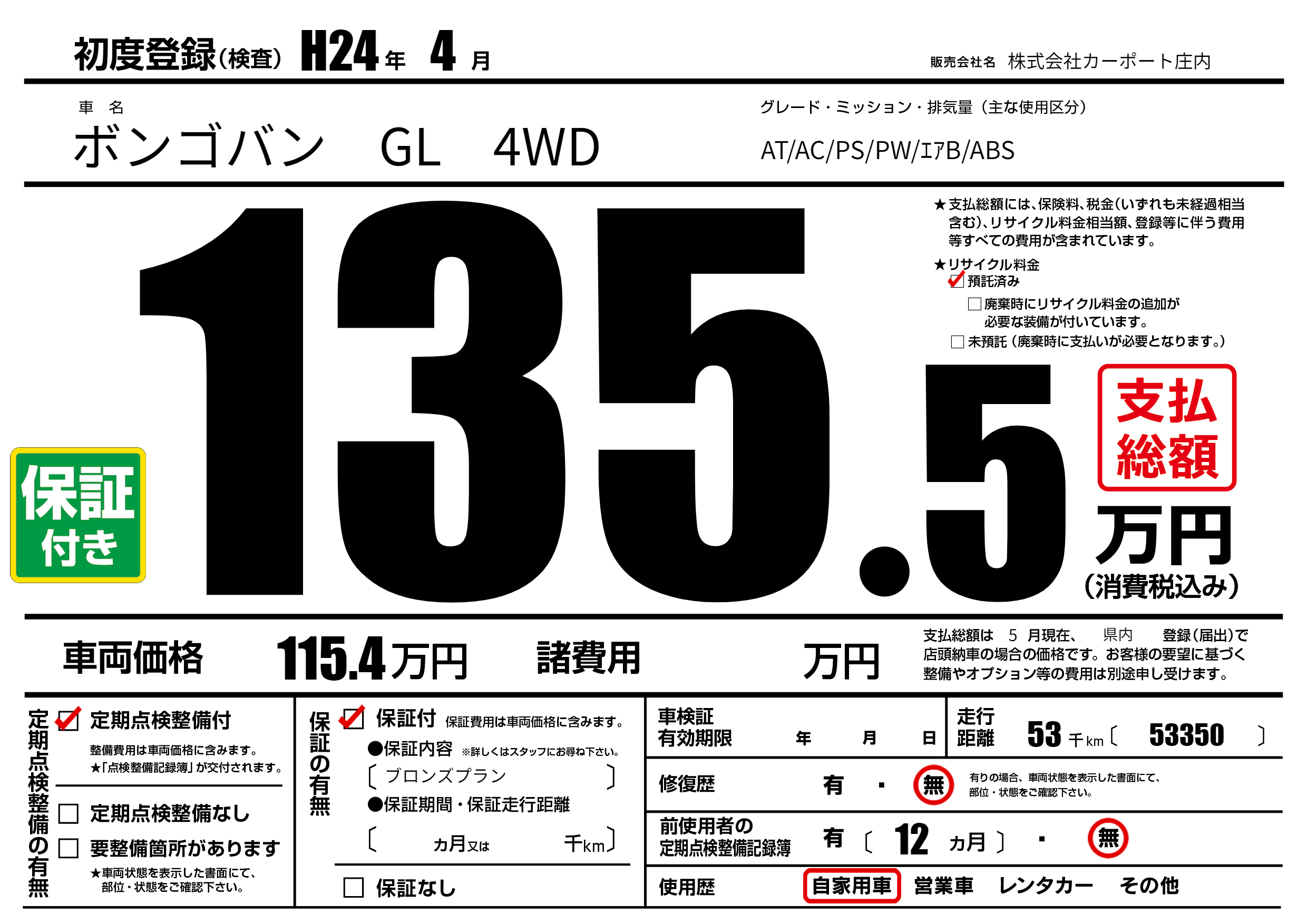 | 車名 | ボンゴバン GL 4WD | グレード ミッション 排気量 |