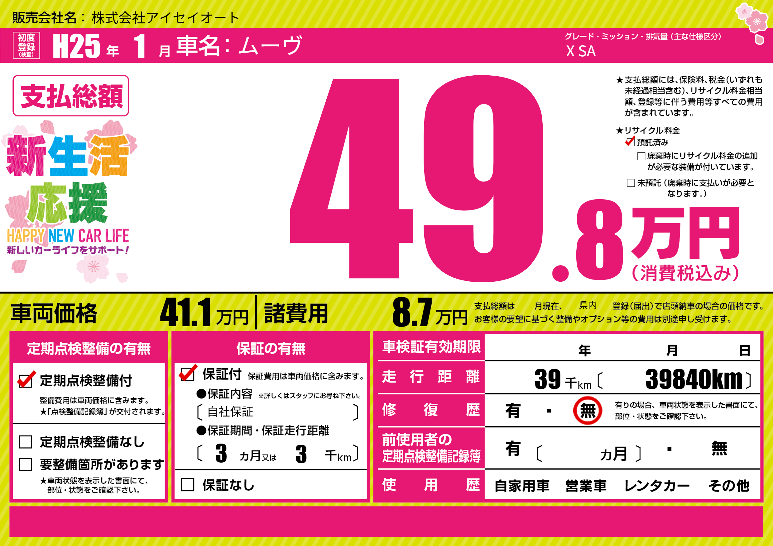 | 走行キロ | 3.9万km | 初年度登録 | H25年1月 |