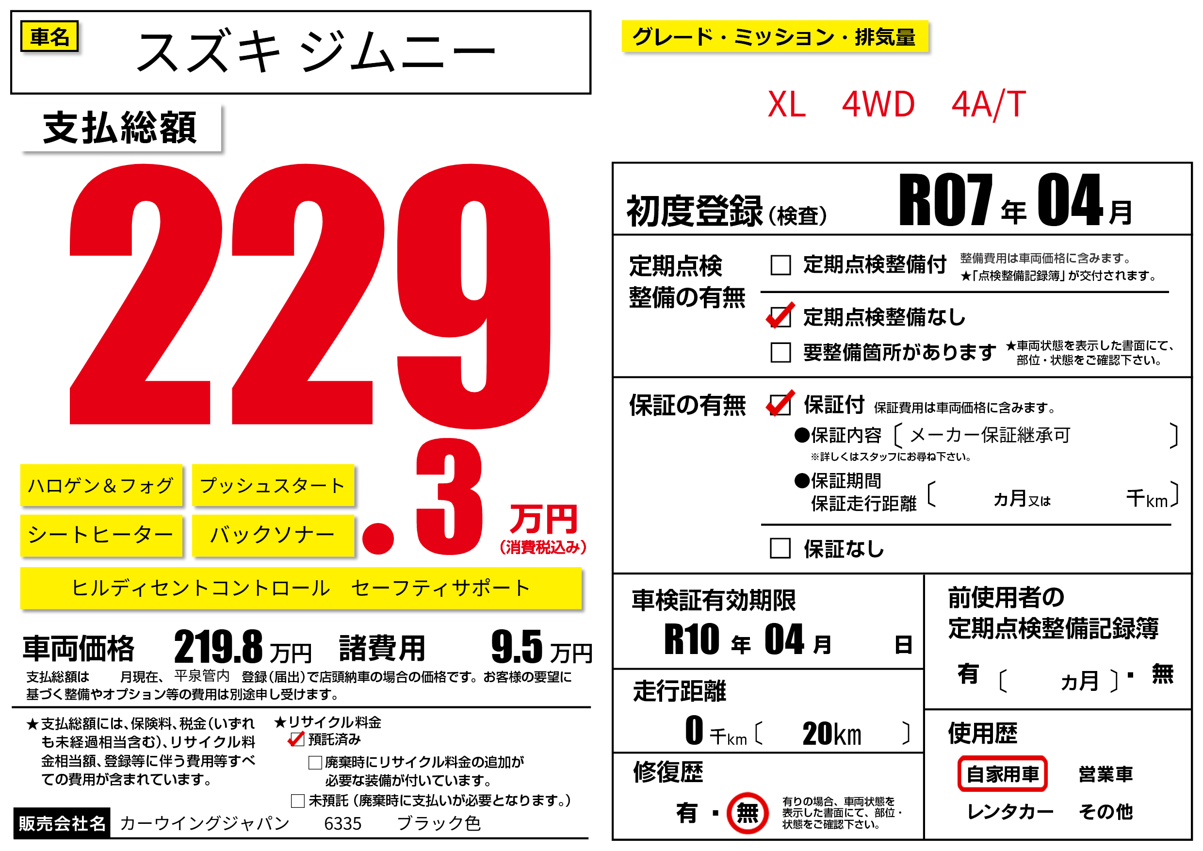 | 車名 | スズキ ジムニー | グレード ミッション 排気量 |