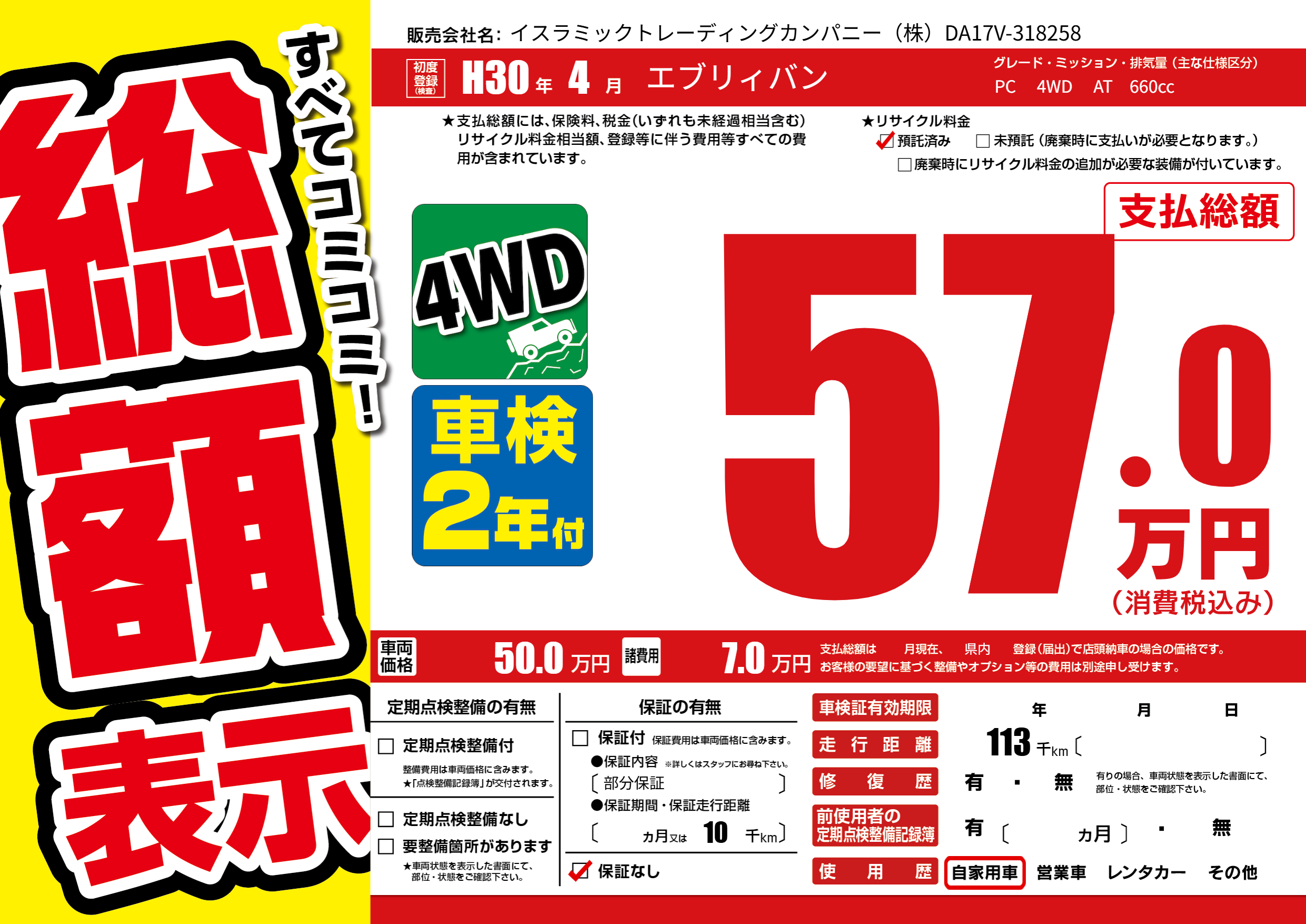 | 車名 | エブリィバン | グレード ミッション 排気量 |