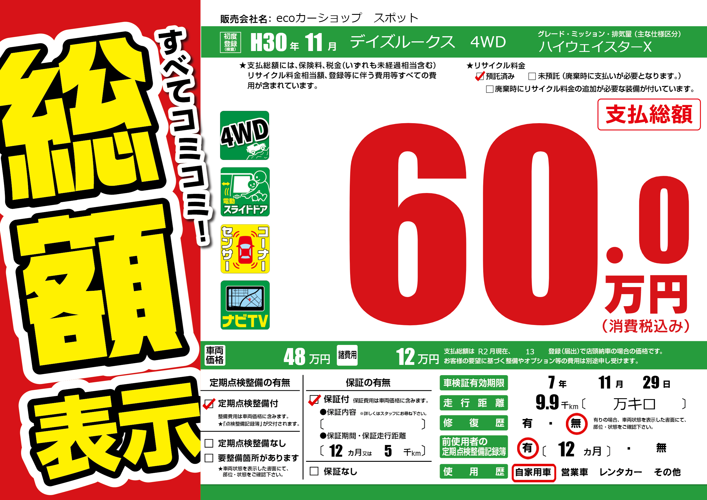 | 車名 | デイズルークス 4WD | グレード ミッション 排気量 |