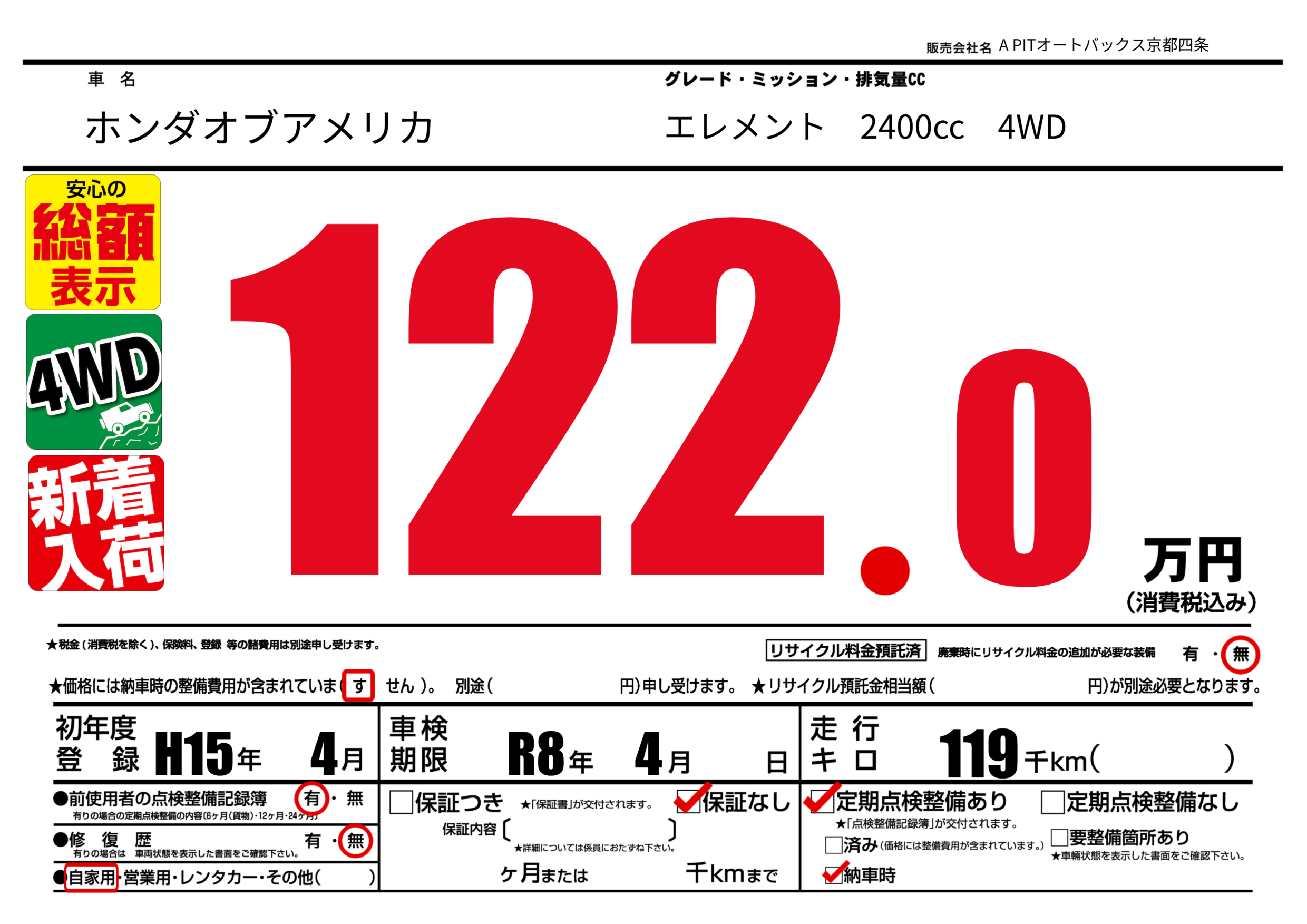 | 車検制限 | R8年 4月 - 日 | ||
