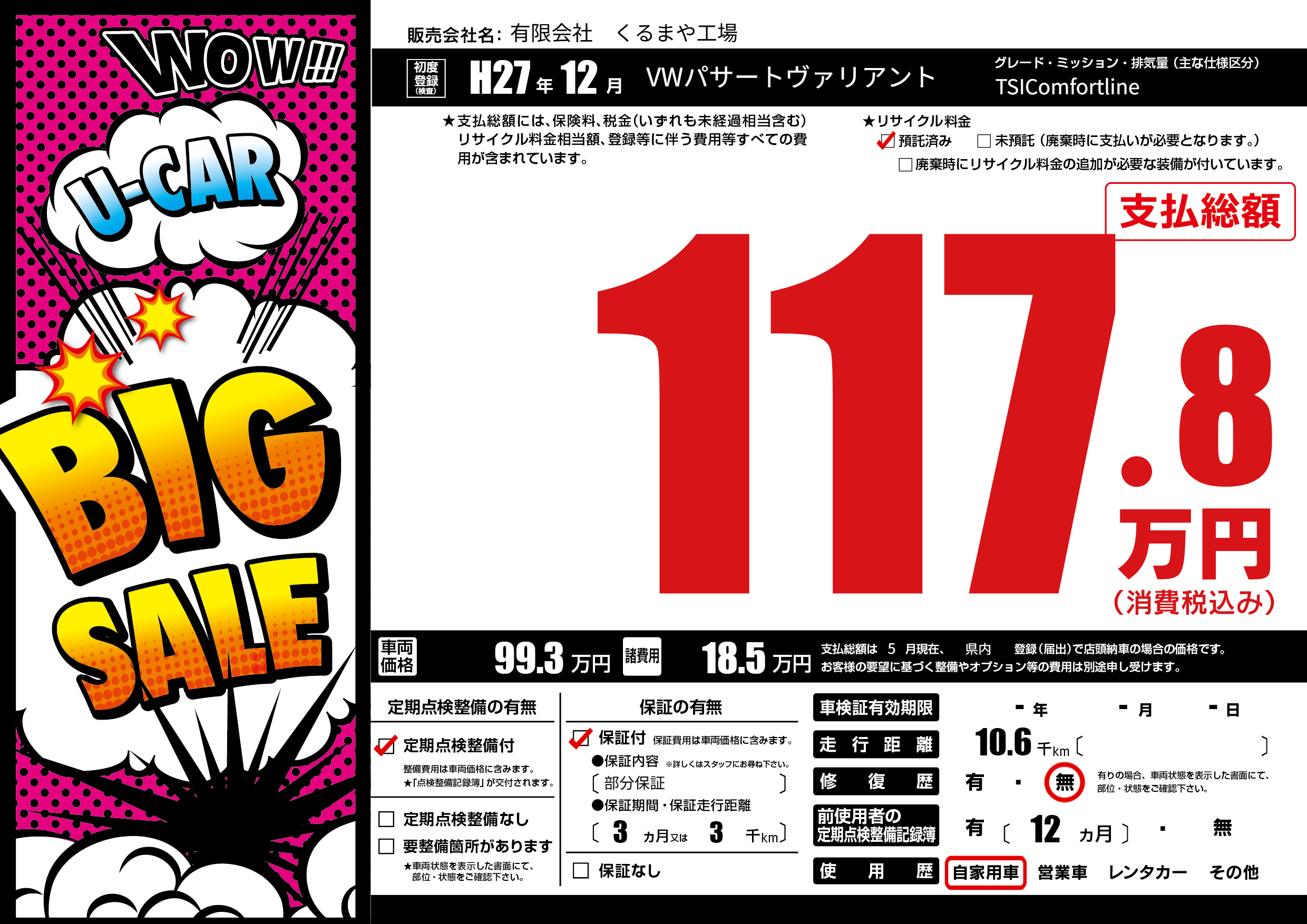 | 車名 | VWパサートヴァリアント | グレード ミッション 排気量 |