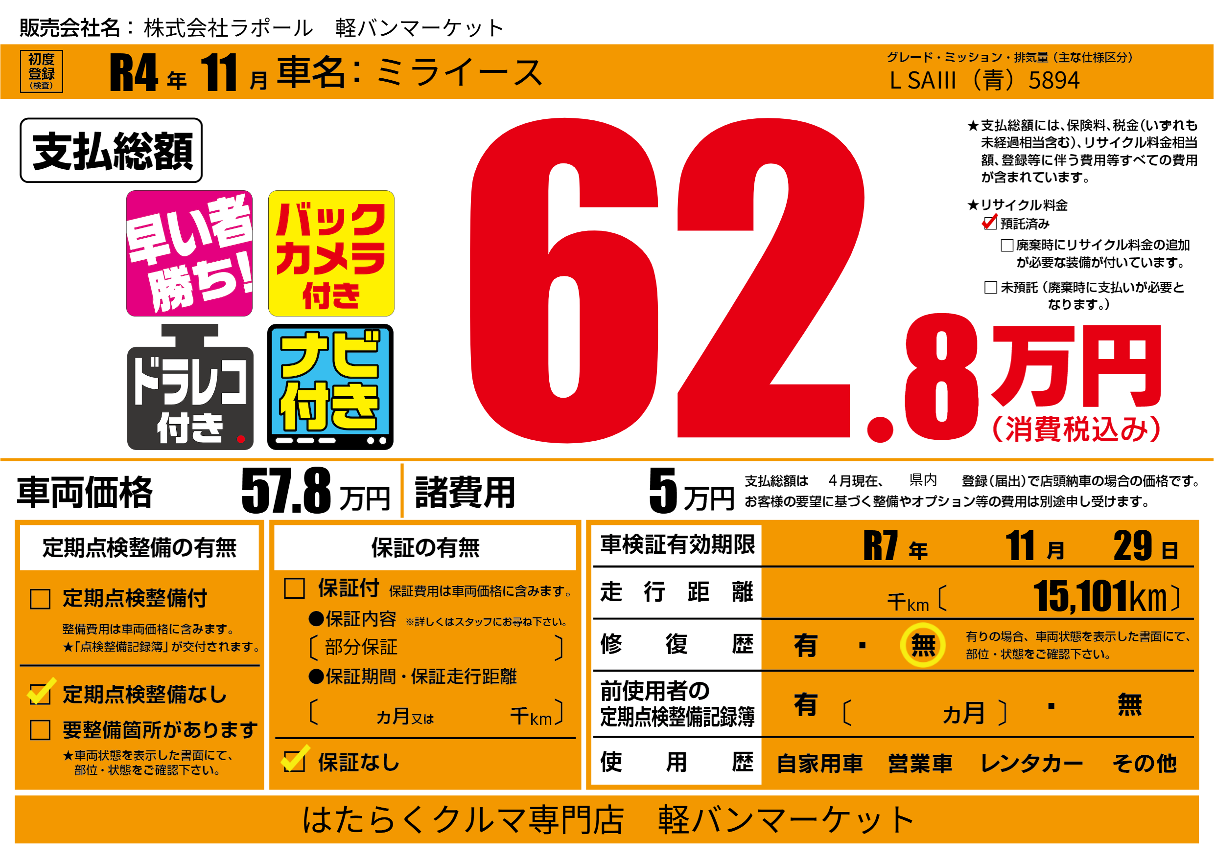 | 走行キロ | - | 初年度登録 | R4年11月 |