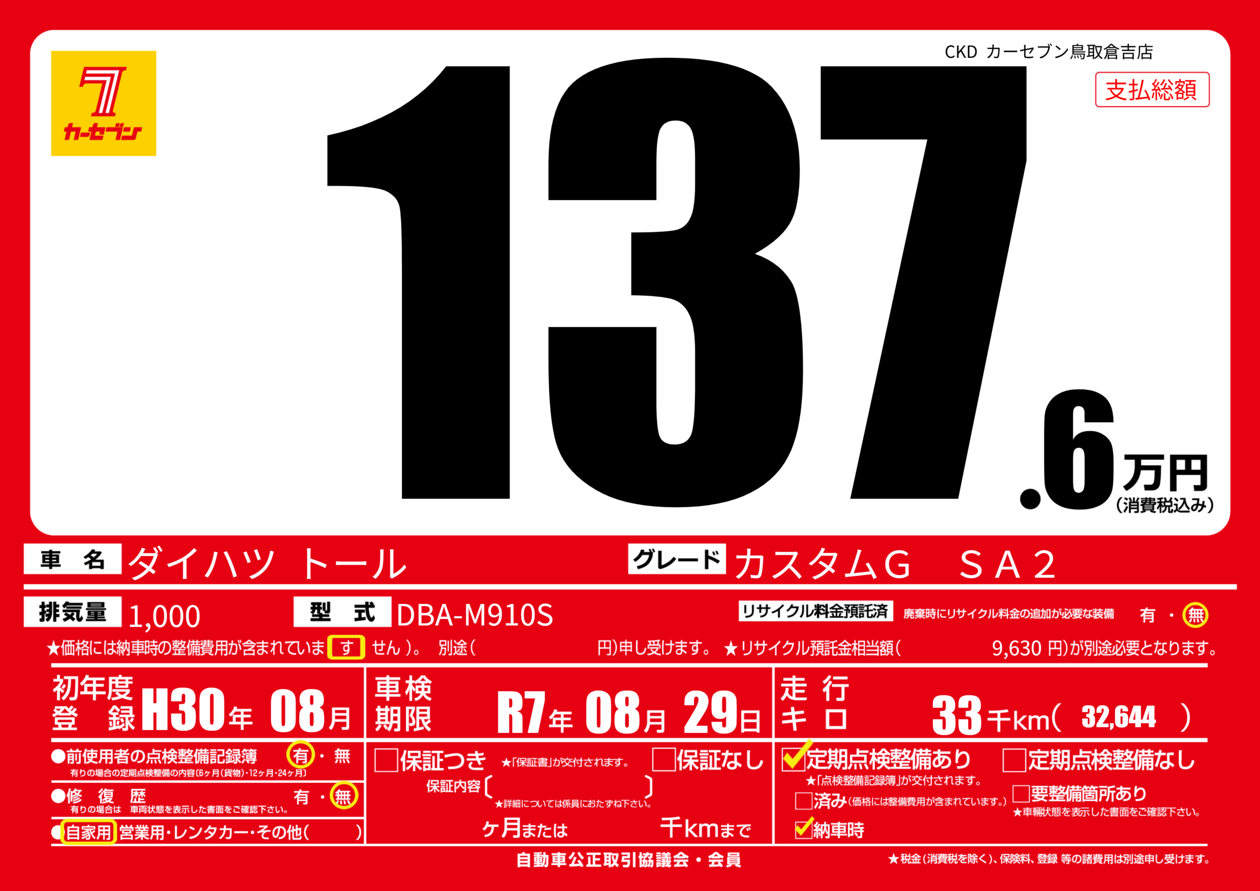 | 定期点検整備 | 定期点検整備あり 納車時あり | ||