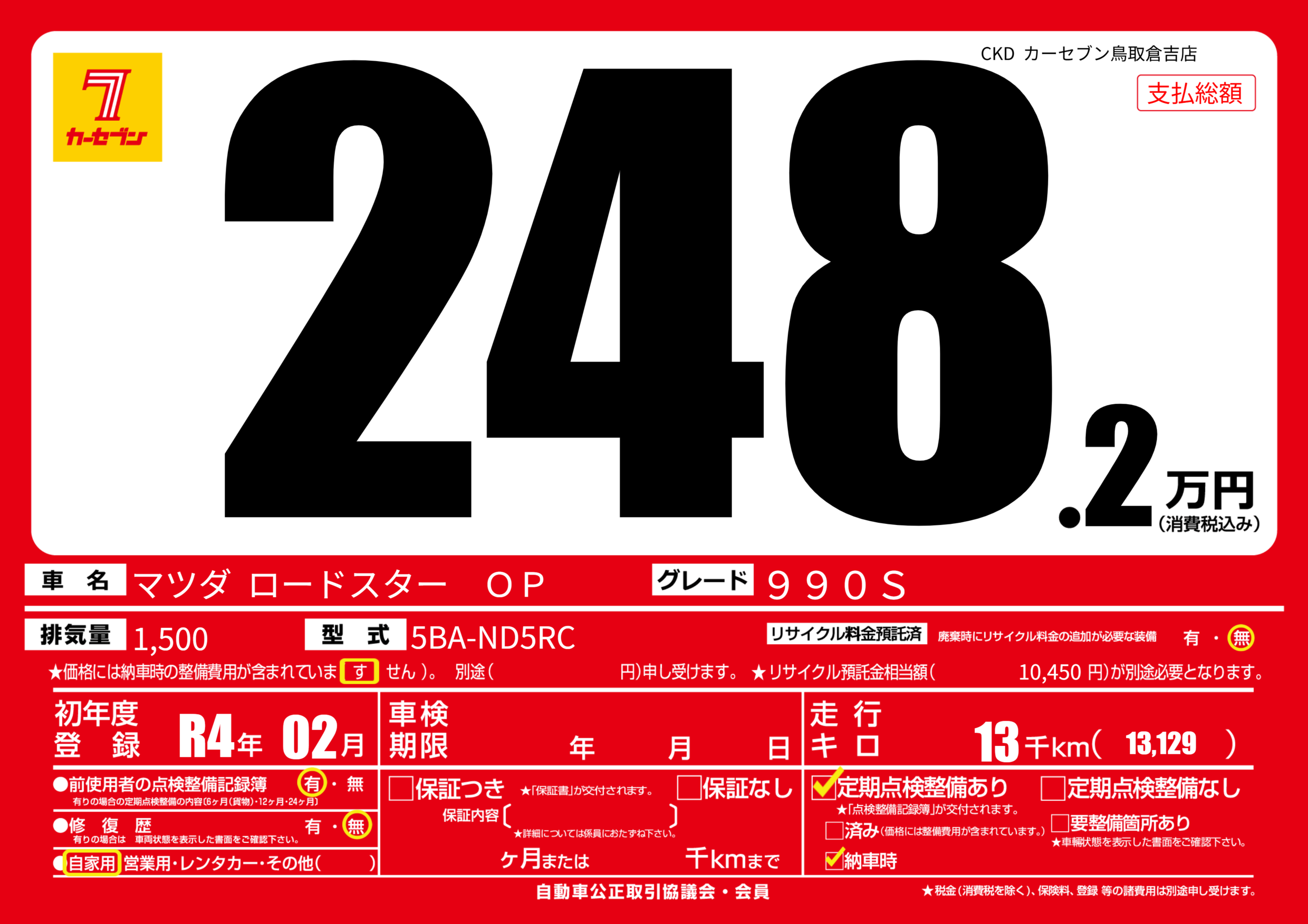 | 走行キロ | 1.3万km | 初年度登録 | R4年02月 |