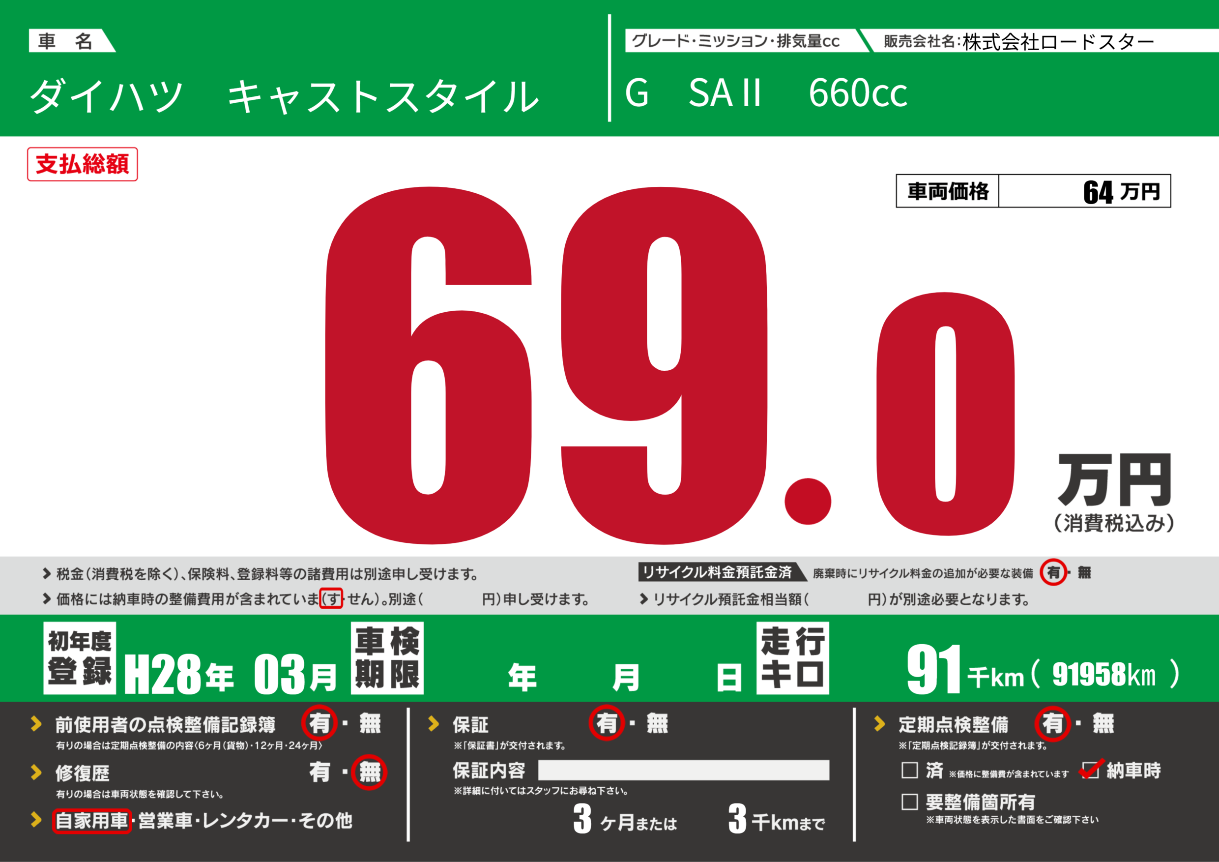 | 定期点検整備 | 定期点検整備あり 納車時あり | ||