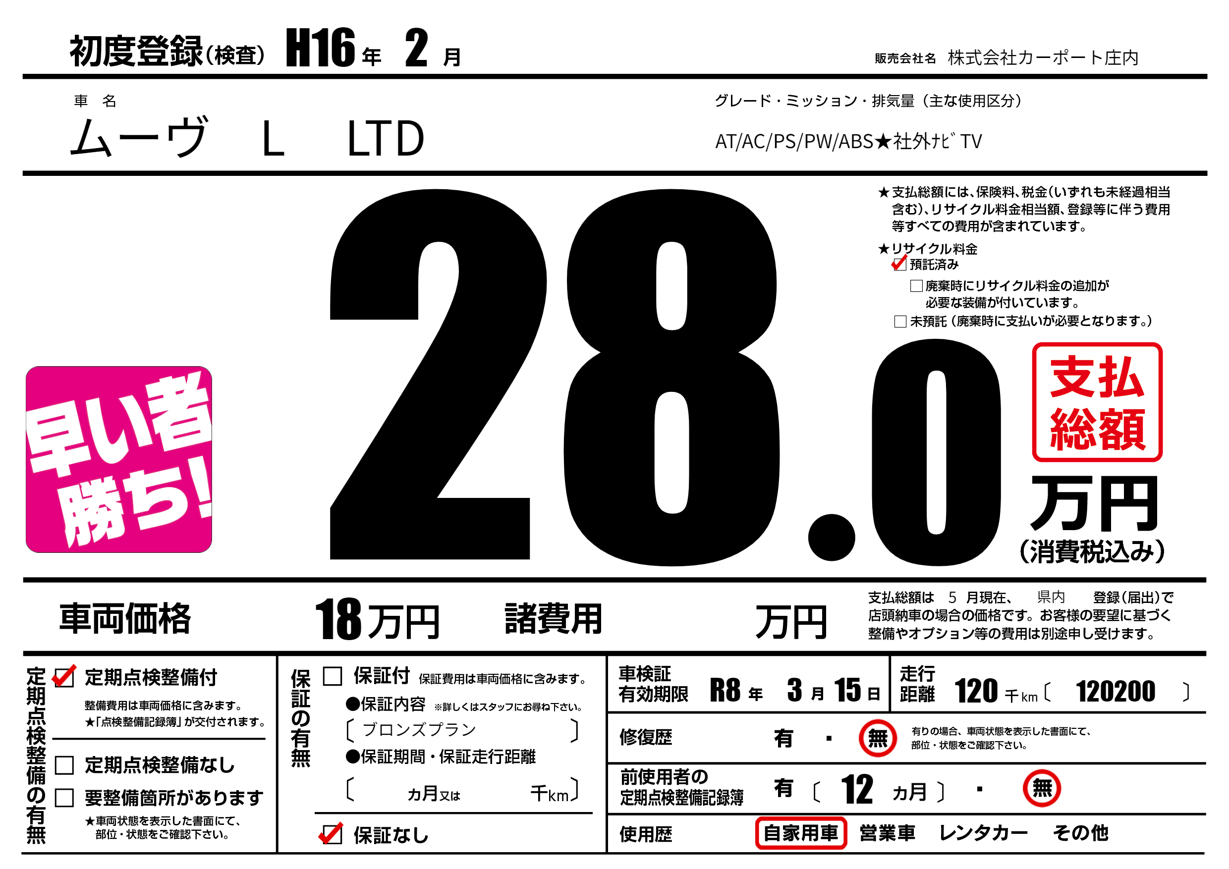 | 車名 | ムーヴ L LTD | グレード ミッション 排気量 |