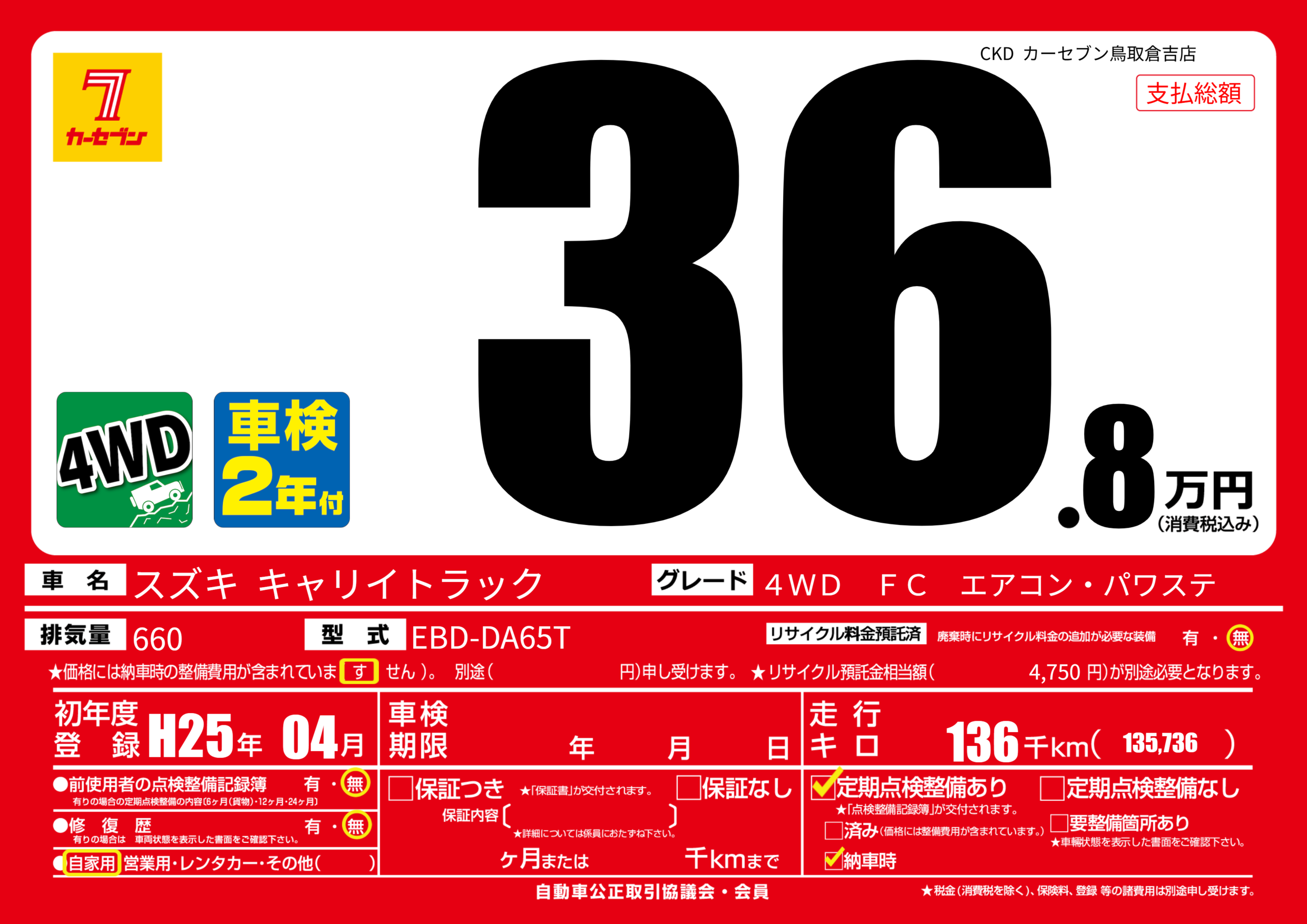 | 走行キロ | 13.6万km | 初年度登録 | H25年04月 |