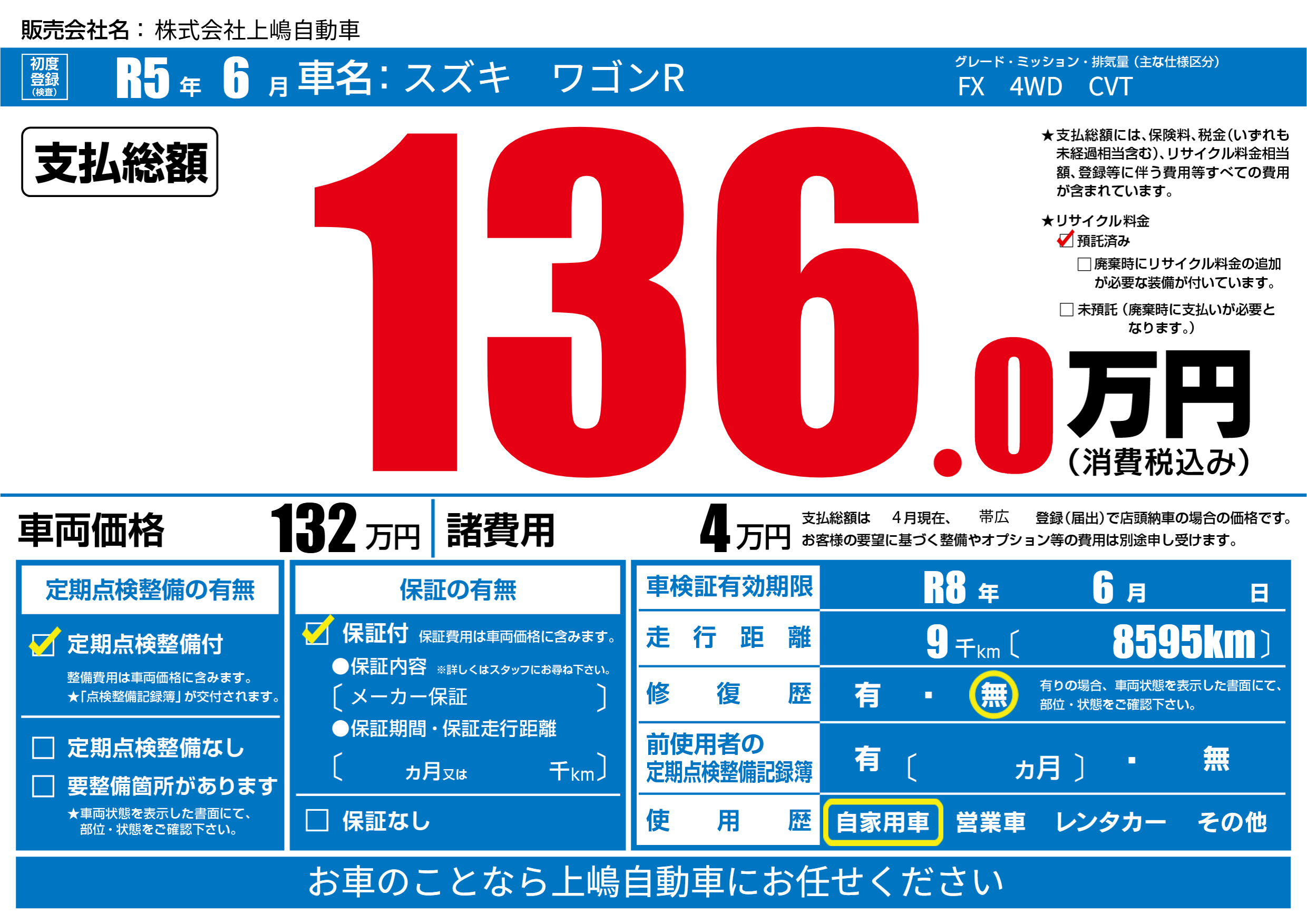 | 車名 | スズキ ワゴンR | グレード ミッション 排気量 |