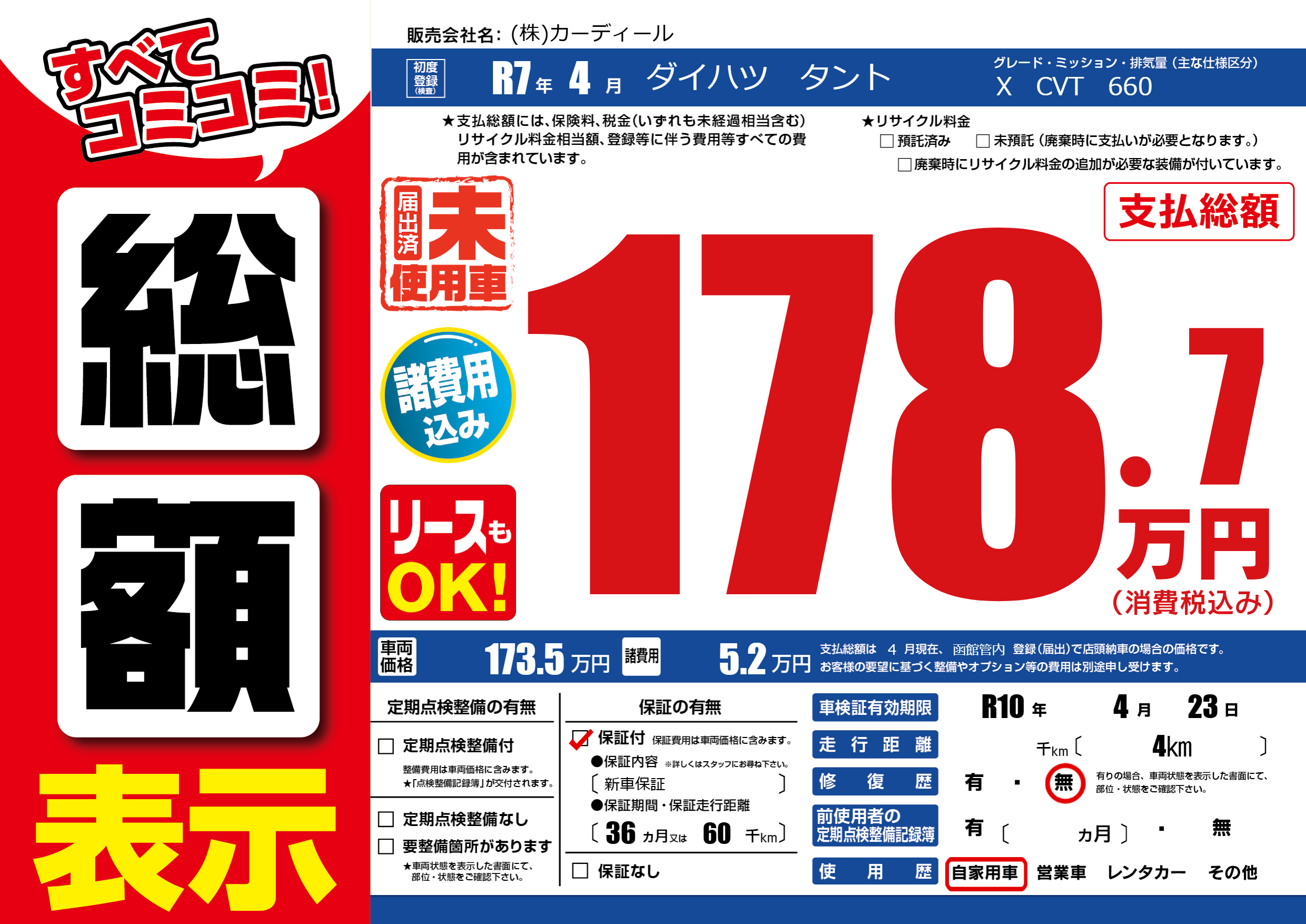 | 走行キロ | - | 初年度登録 | R7年4月 |
