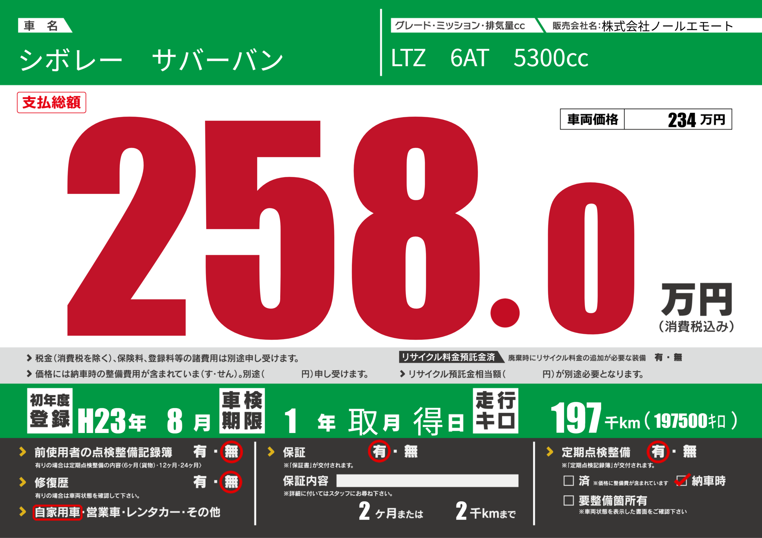 | 車名 | シボレー サバーバン | グレード ミッション 排気量 |
