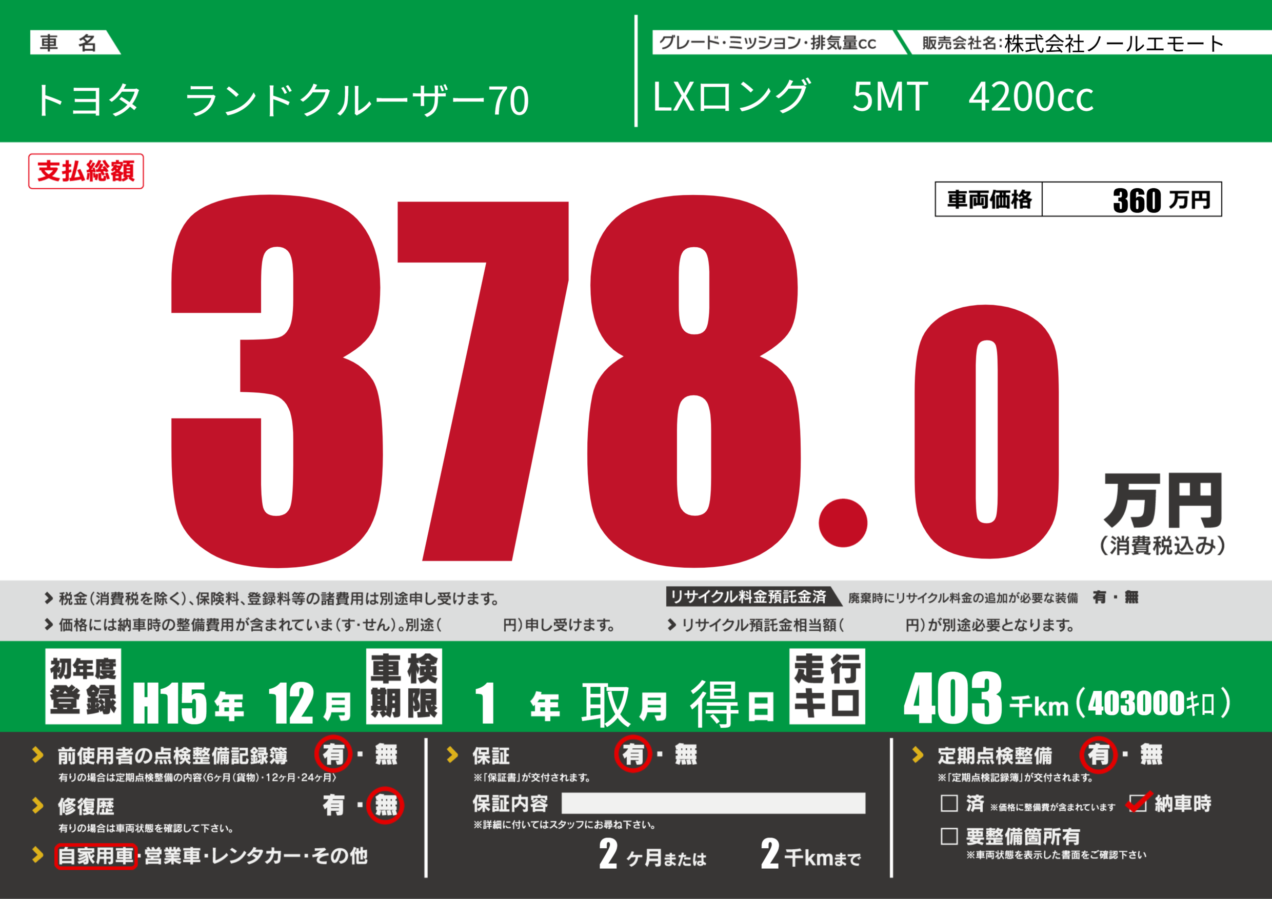 | 車名 | トヨタ ランドクルーザー70 | グレード ミッション 排気量 |