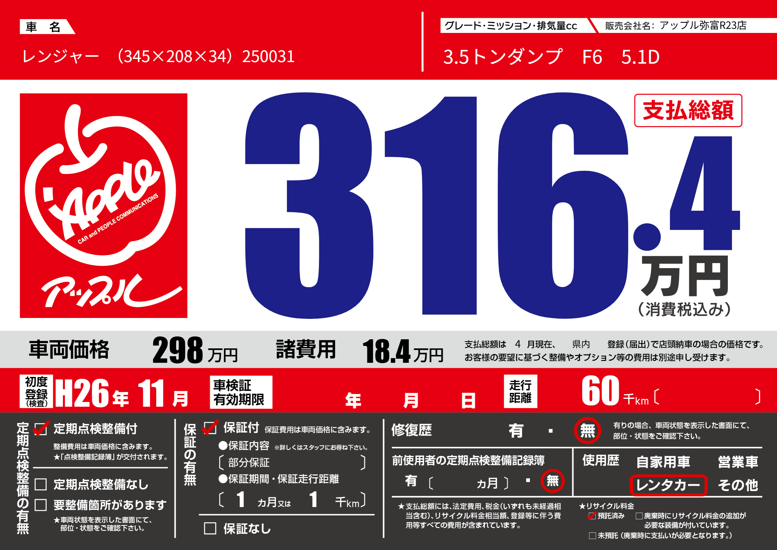 | 車名 | レンジャー (345×208×34)250031 | グレード ミッション 排気量 |