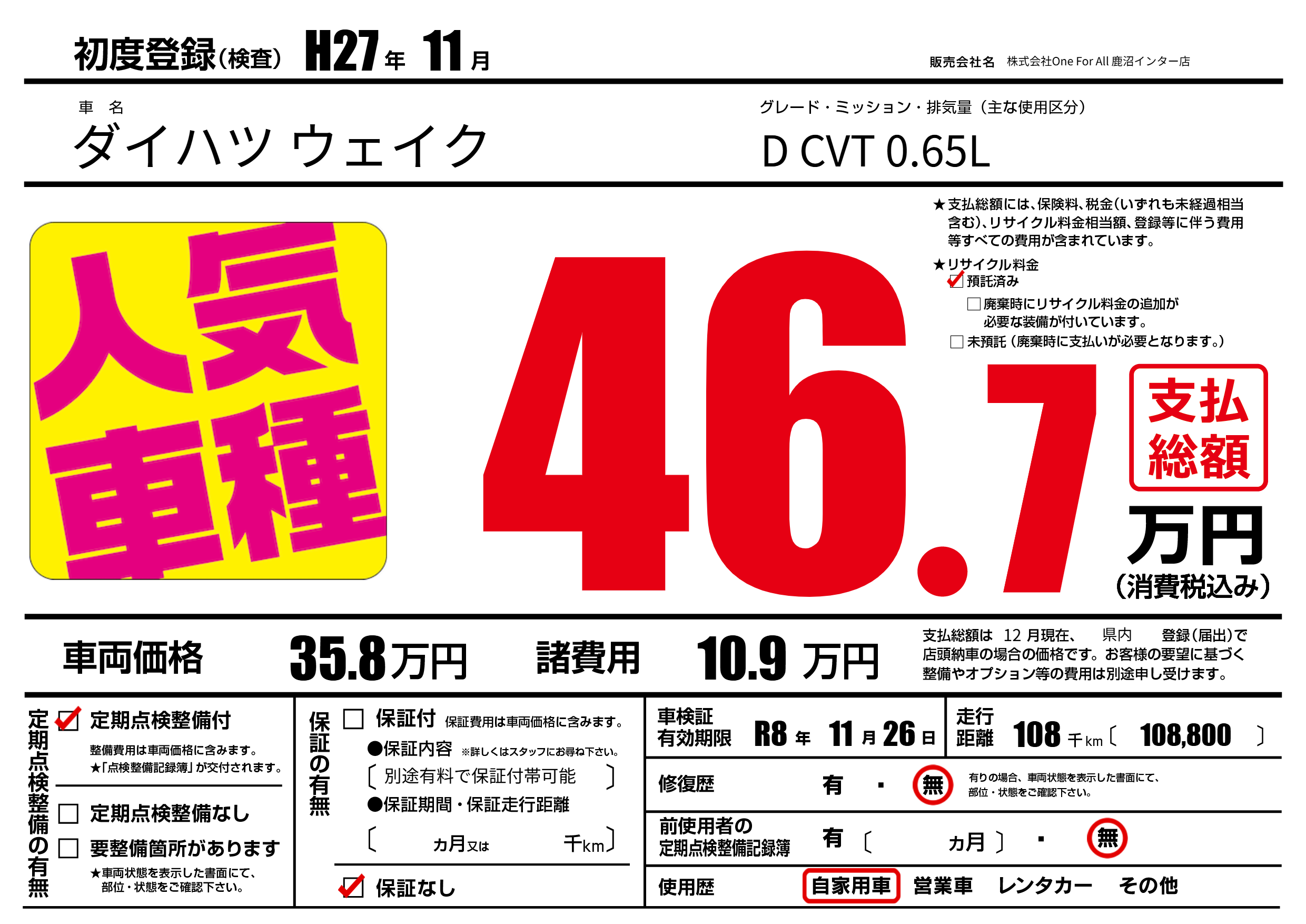 | 走行キロ | 10.8万km | 初年度登録 | H27年11月 |
