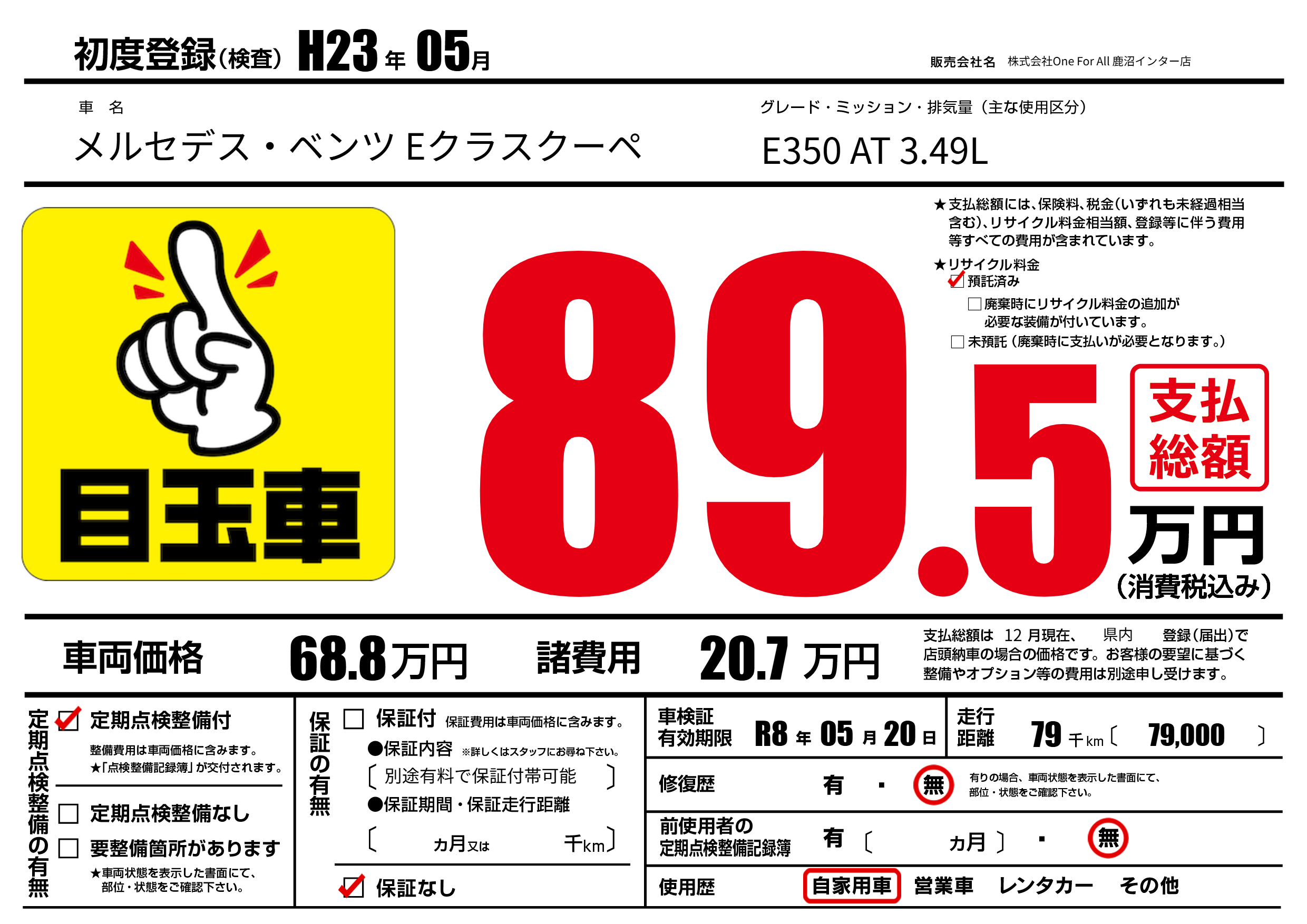 | 車名 | メルセデス・ベンツ Eクラスクーペ | グレード ミッション 排気量 |