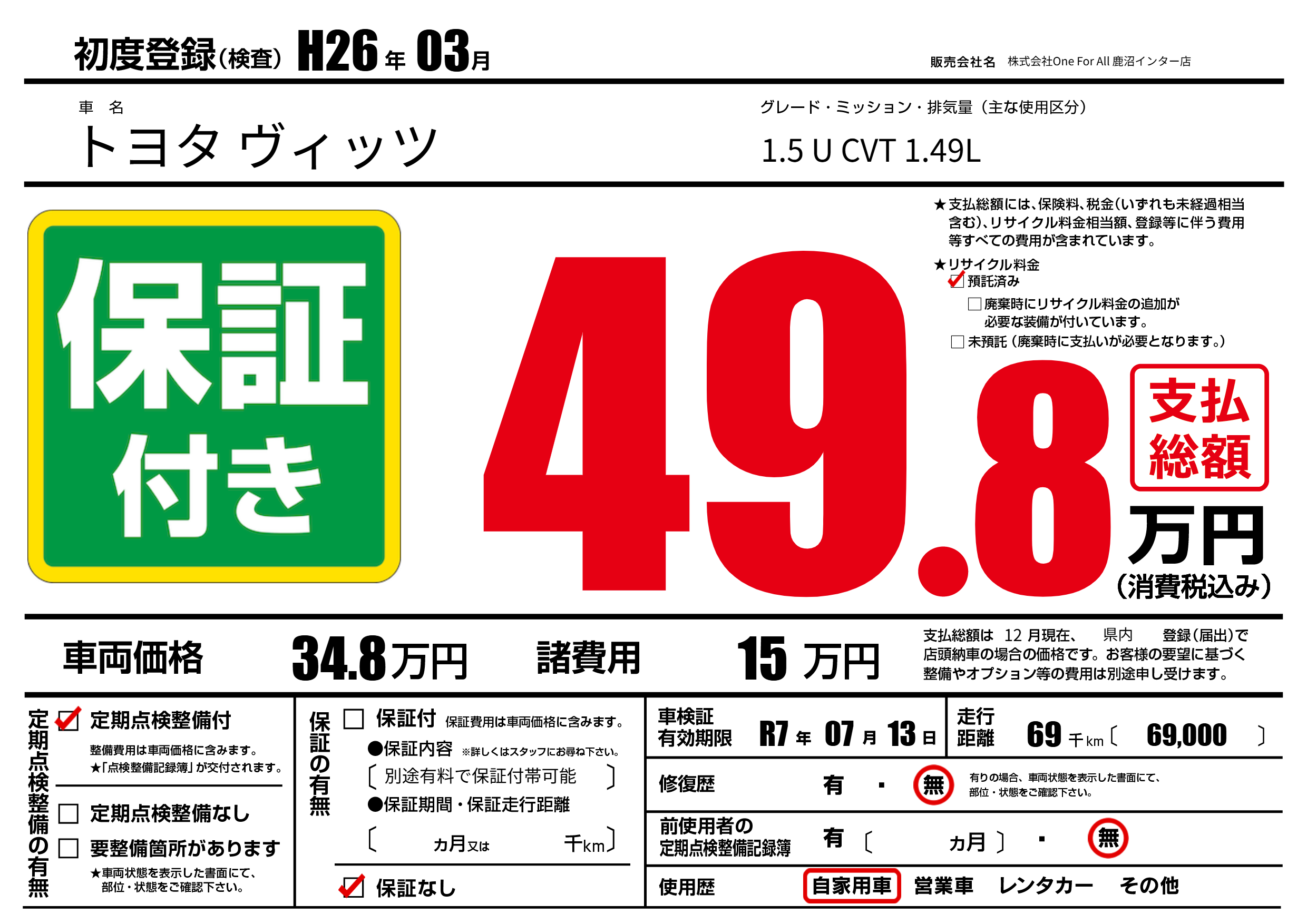 保証なし 保証内容(別途有料で保証付帯可能) ---ヶ月または()千kmまで |