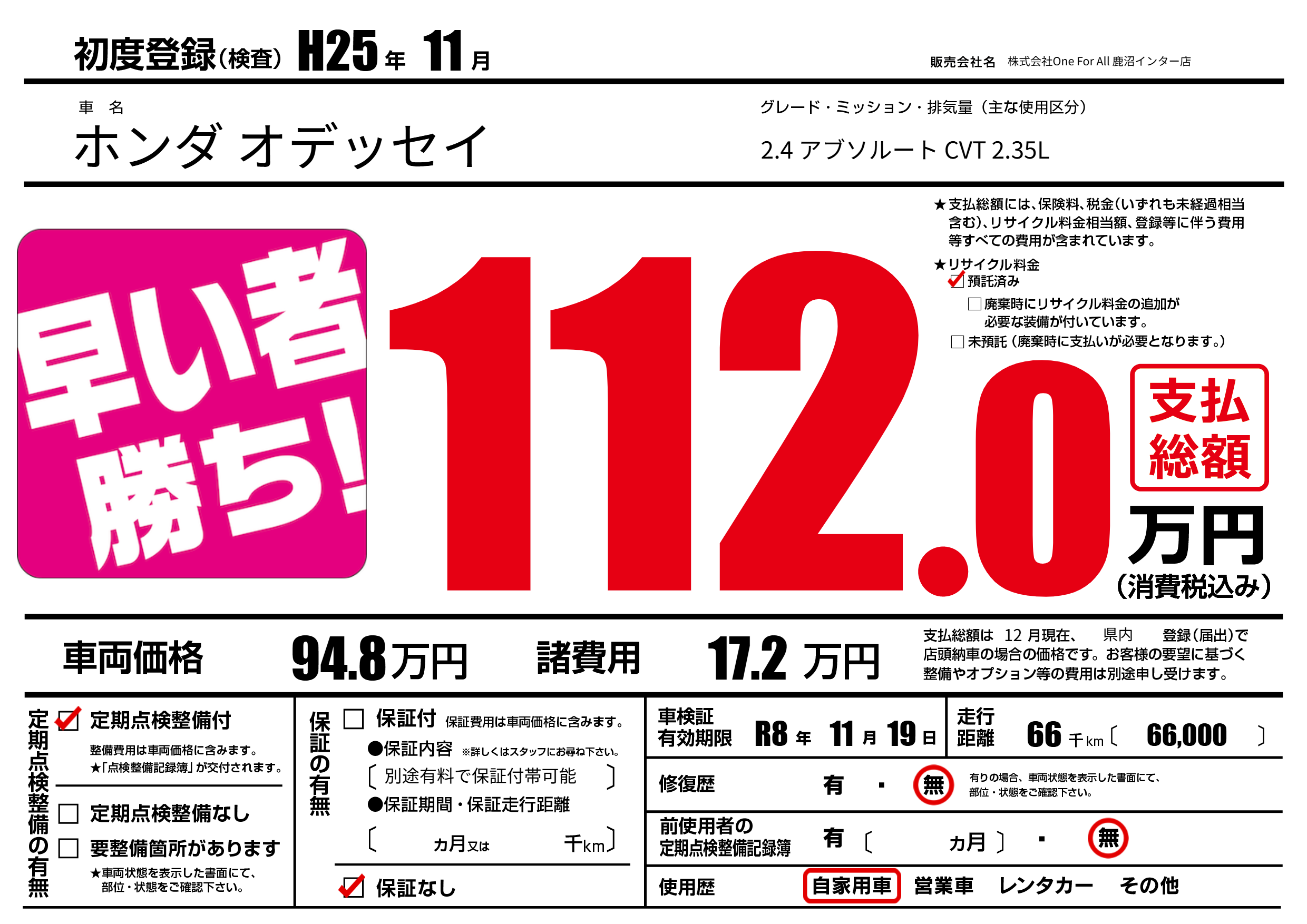 | 走行キロ | 6.6万km | 初年度登録 | H25年11月 |