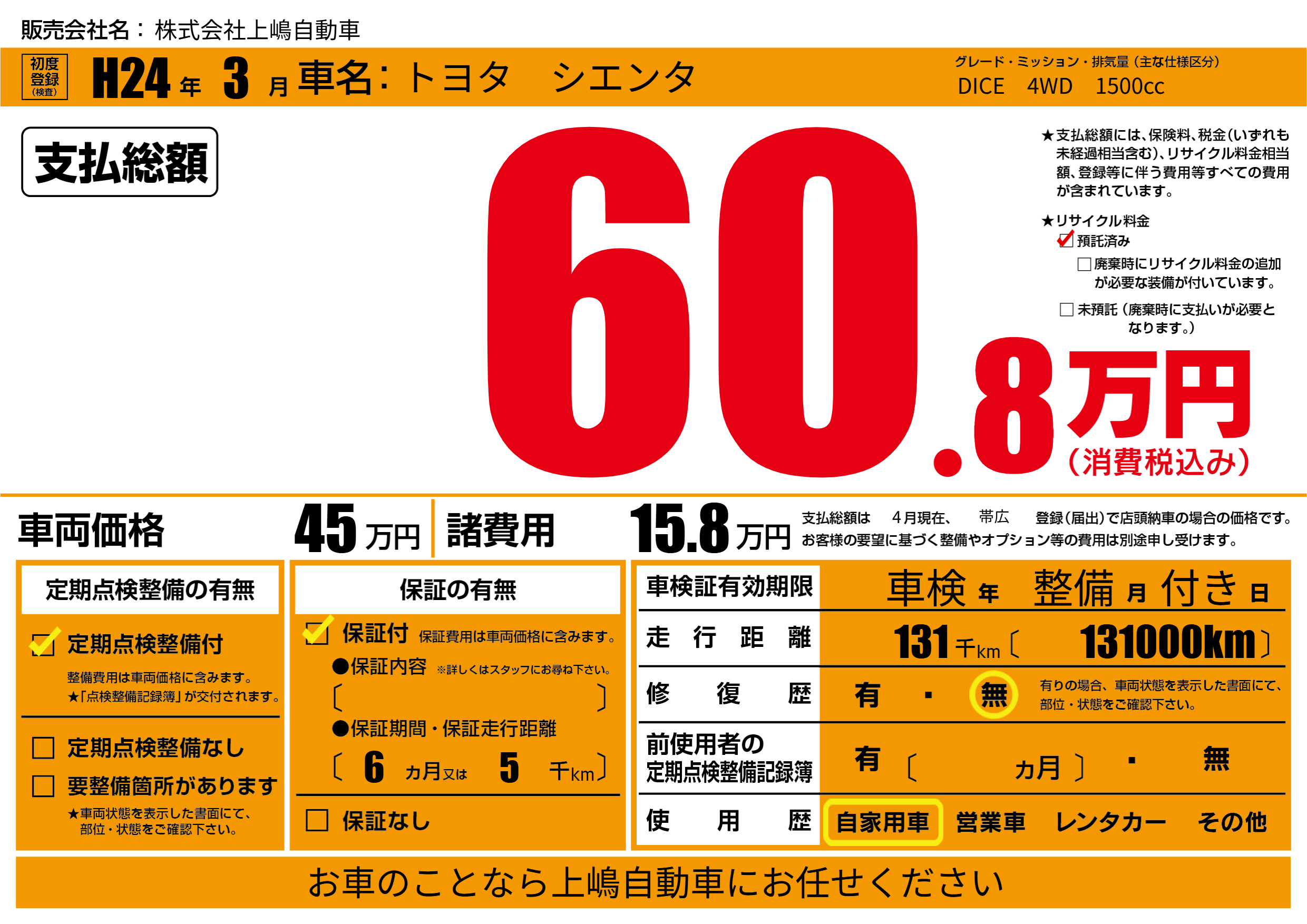 | 車名 | トヨタ シエンタ | グレード ミッション 排気量 |