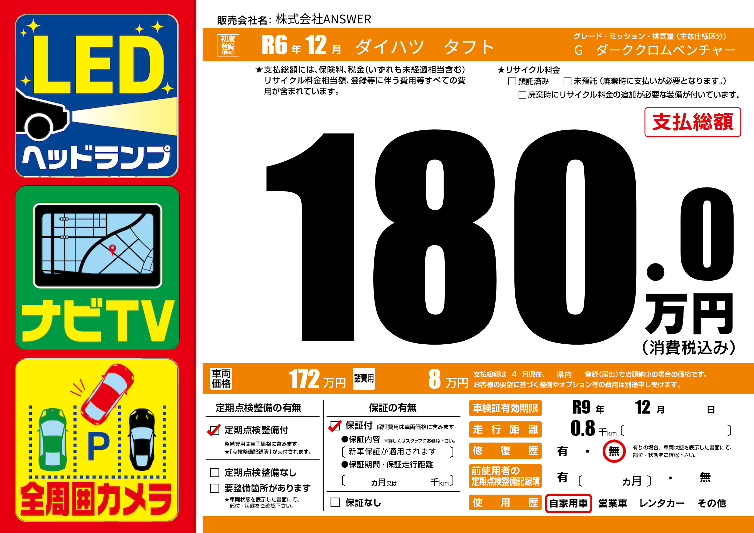 | 車名 | ダイハツ タフト | グレード ミッション 排気量 |
