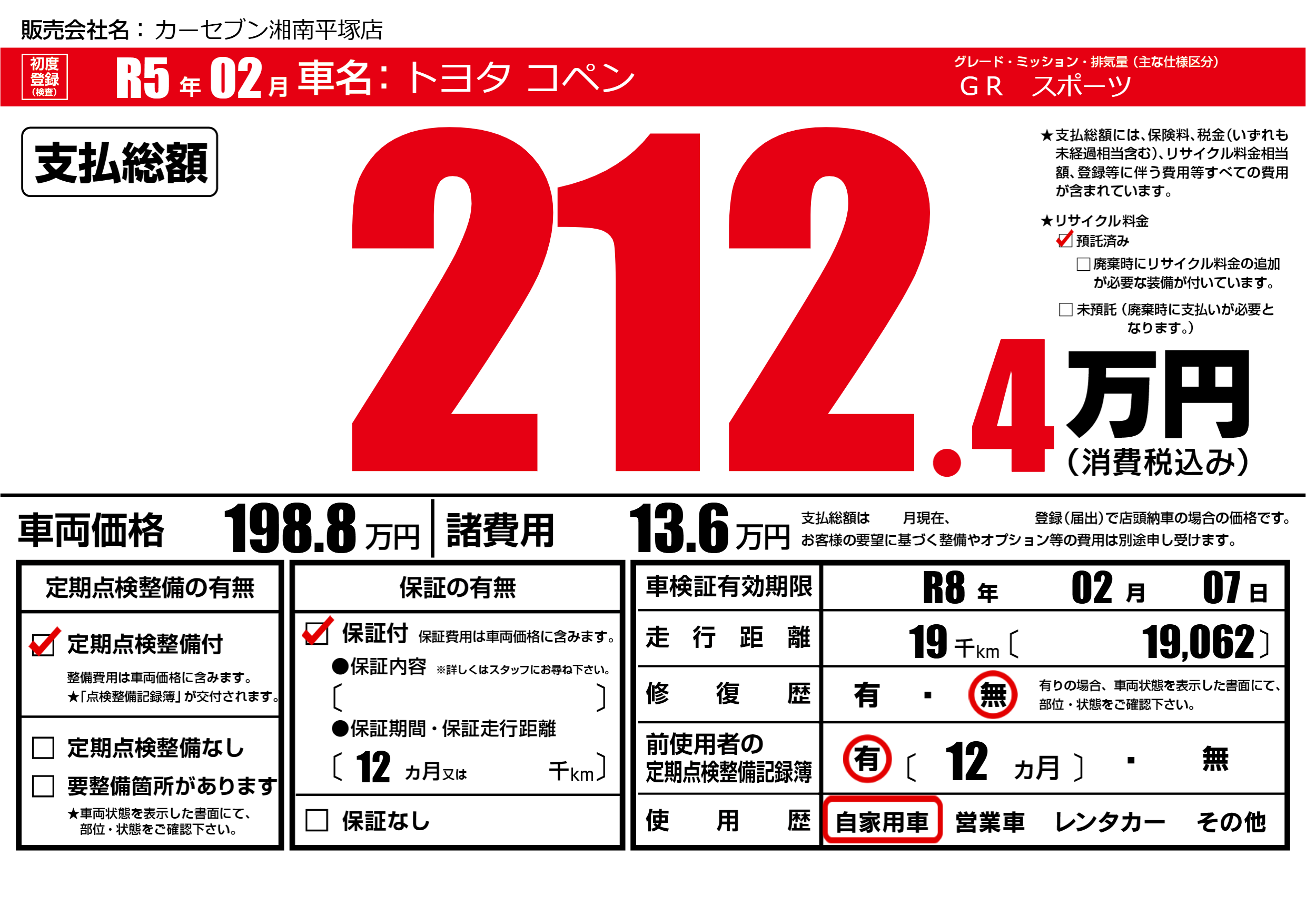 | 車名 | トヨタ コペン | グレード ミッション 排気量 |