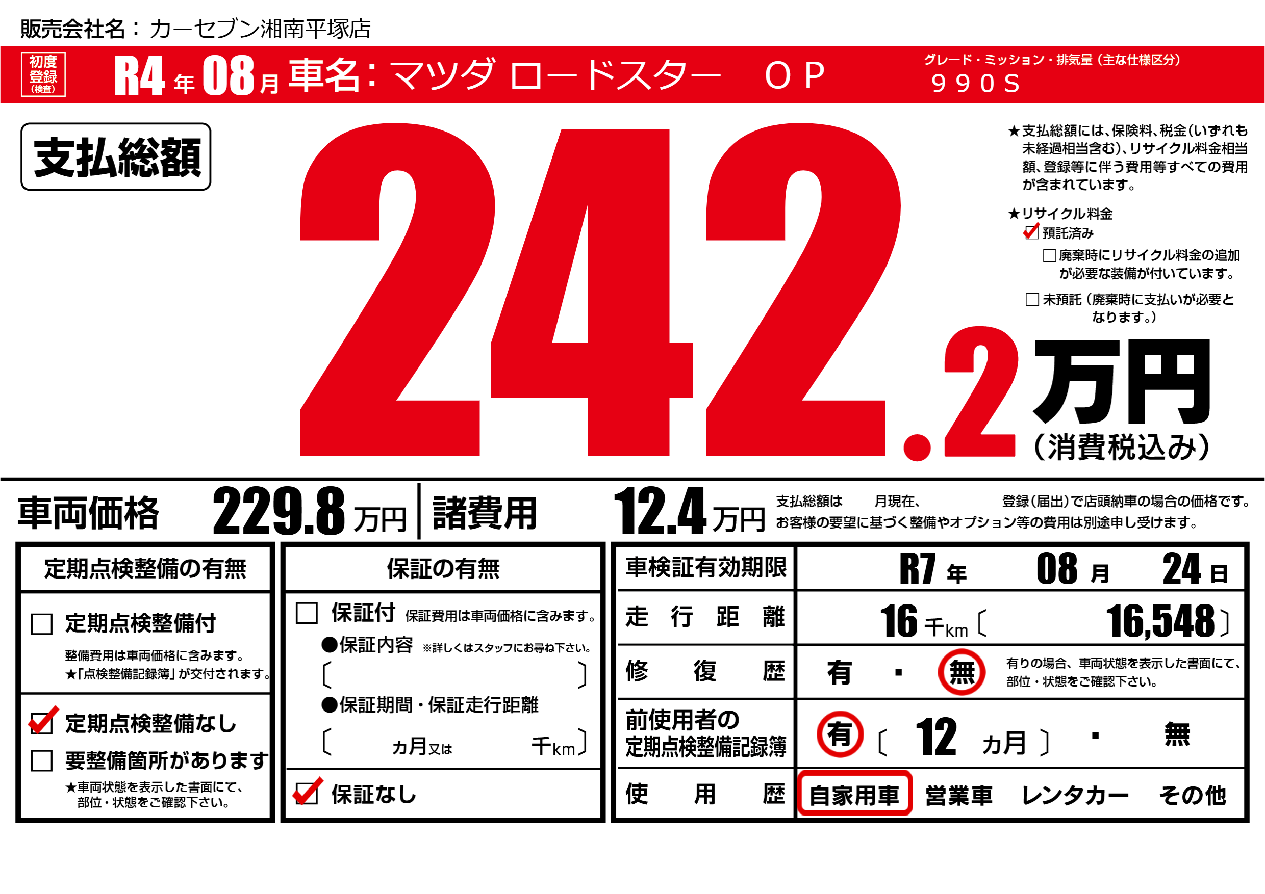 | 車名 | マツダ ロードスター OP | グレード ミッション 排気量 |